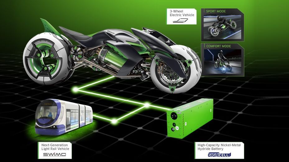 川崎在2013年的日本東京摩托車展中展出的概念車款“J”,是一款運(yùn)用了川崎重工電池控制技術(shù)的3輪純電驅(qū)動(dòng)EV車款,動(dòng)力來(lái)源是能夠高速充電與放電的大容量電池“GIGACELL”。