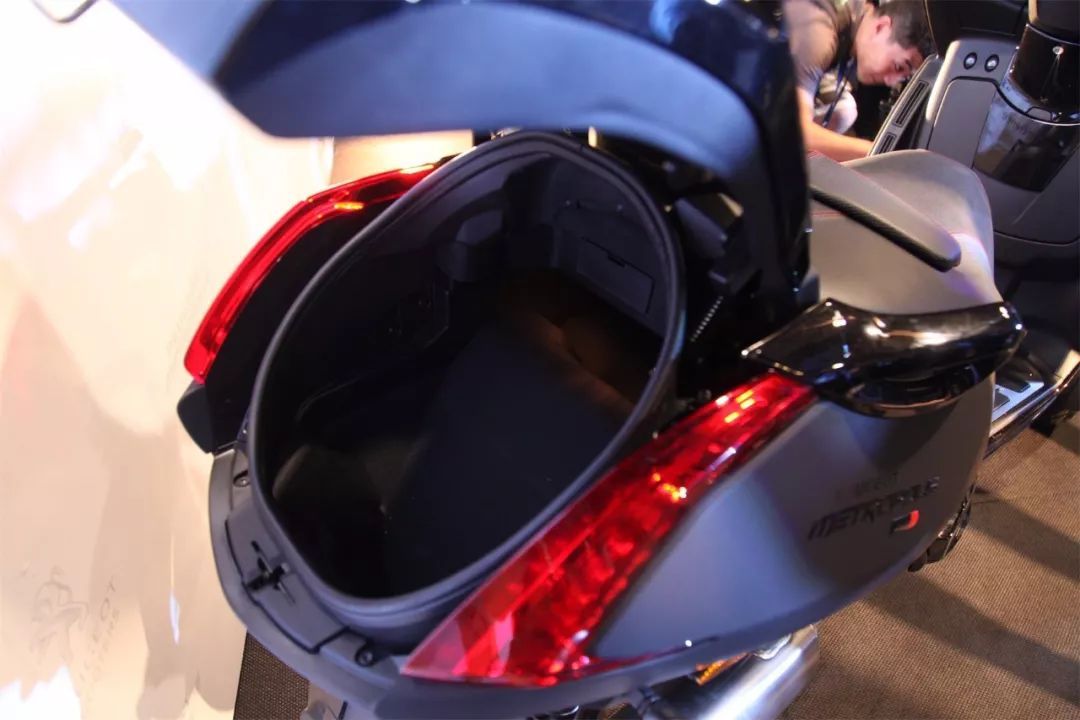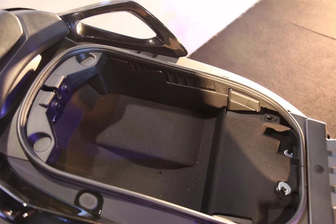 作為擁有DTW同步雙傾系統(tǒng)的倒三輪踏板車,最大傾角可達到39°。標(biāo)致Metropolis RXR還帶有雙前輪傾斜鎖定功能,當(dāng)你停車時不用擔(dān)心這輛車會傾倒。這款車畢竟還是一款踏板車,所以在實用性上廠家也做了考量,Metropolis RXR儲物空間非常充足,由于結(jié)構(gòu)優(yōu)勢,前儲物空間相比一般踏板車來的更大,前儲物空間有兩個,車把左下方有個小型儲物空間,里面有USB接口可以為手機充電,而下方的儲物空間就明顯比一般踏板車大得多了。