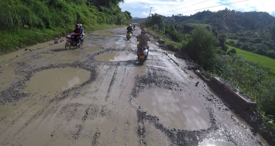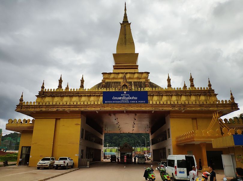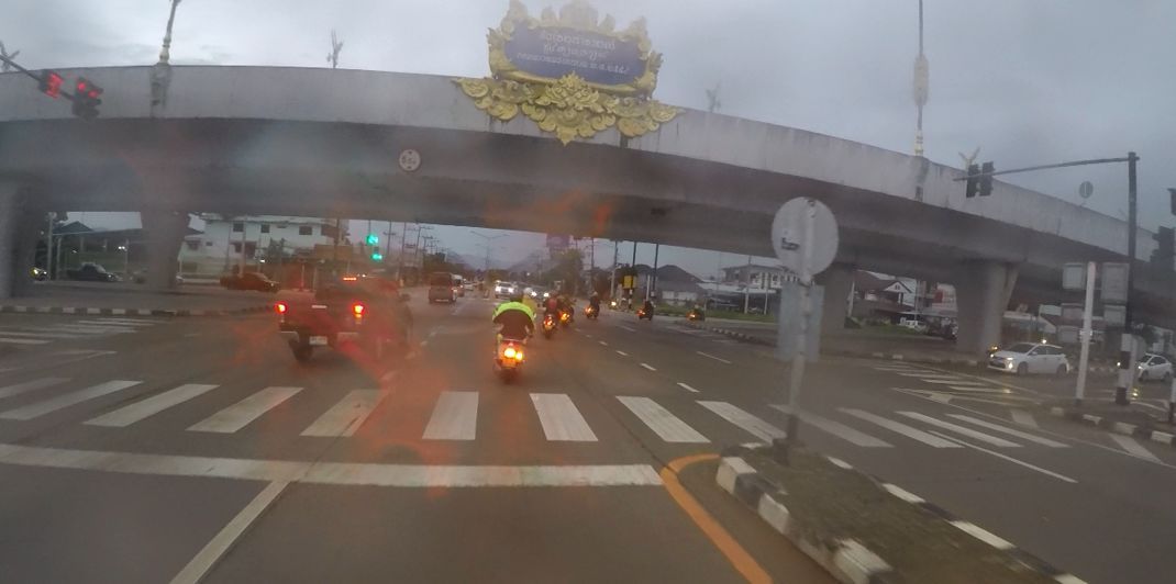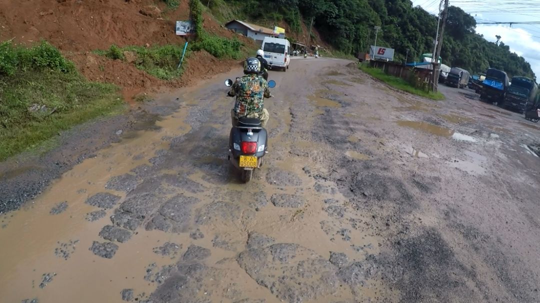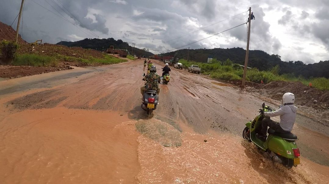 中午在磨憨縣午飯后補滿油,來到磨憨口岸準(zhǔn)備通關(guān),磨憨口岸與老撾磨丁口岸對接,是中老兩國唯一的國家級一類口岸。在海關(guān)辦理完相關(guān)手續(xù)后,我們從磨憨口岸駛出國門,向前幾百米,就可以看到金光閃耀的老撾國門,在這里要再經(jīng)過一道檢查。從老撾國門至老撾海關(guān)之間有幾公里爛路,因為正值雨季,雨水將兩邊山上的紅土沖刷下來,和成稀泥。幾公里的路上遍布了大大小小的炮彈坑、碎石和泥水潭,等大家閃轉(zhuǎn)騰挪的通過后,大家原本嶄新的車上已布滿泥點,典雅中帶有一絲野性,別有一番風(fēng)味。雖然整車車重達到了160kg,但在各種閃躲操控中,車輛的靈活性絲毫不差。在老撾海關(guān)等待許久辦完入境后,駛過幾公里同樣的爛路,便開始進入山區(qū),此時已經(jīng)北京時間下午4點。