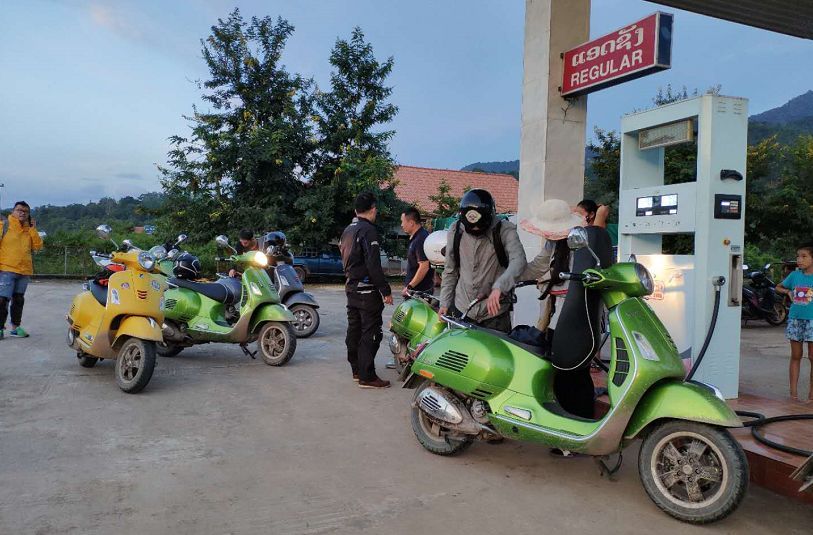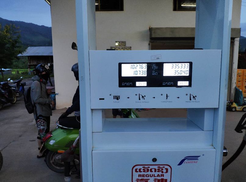 北京時間7點半時,車隊進入老撾后第一次補油,此時距離目的地還有70多公里,天色也在逐漸變暗。在這里共補油35升,油費花費了33.5萬老撾基普,在這里,百萬富翁的門檻真的很低。33.5萬老撾基普按當(dāng)天匯率折算差不多7.6元人民幣一升,因為老撾石油全靠進口所以價格比國內(nèi)稍貴,而且標(biāo)號未知,顏色為紅色。等加完油再上路時天色已經(jīng)全黑,車隊不得不放慢速度。在這里發(fā)現(xiàn)GTS 300的近光燈照射范圍太近,經(jīng)常需要切換遠光燈來確定路面情況,但又沒有超車燈按鍵,所以操作較為不便。此處路上灰塵真的是特別多,鋪天蓋地,嚴重時燈光都穿不透,處于失明狀態(tài)。到達目的地會曬時已快到北京時間10點,當(dāng)日行程共428公里。