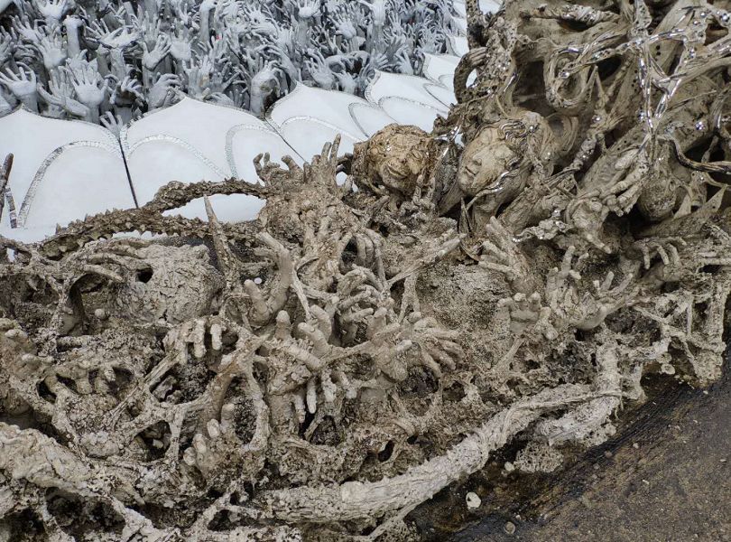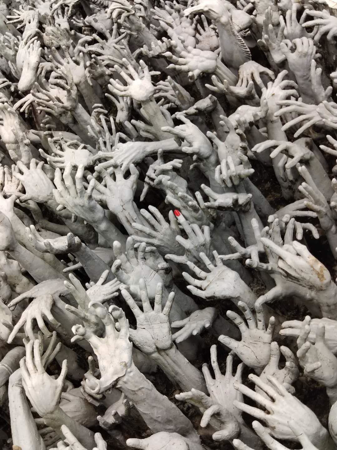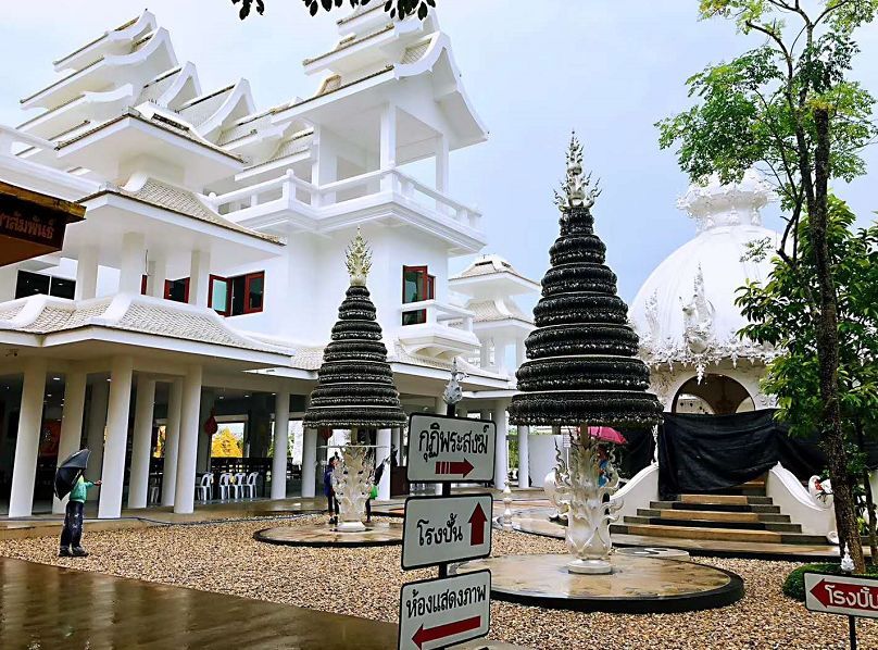從清萊出發(fā)前往清邁在雨中游覽了清萊的代表性景點——白廟,這座現(xiàn)代化風(fēng)格的寺廟不同于別處,屋頂、墻壁、基座都為純白色,代表著純潔的心靈。大量的復(fù)雜雕塑和建筑上都貼有閃亮的玻璃鏡片,則是智慧的象征。令人印象更深刻的是一片白色建筑中搶眼的黃金廁所,許愿廊上掛著密密麻麻的香客的許愿牌,以及奈何橋下千百只吶喊、掙扎的手,是地獄里等待被救贖的靈魂...