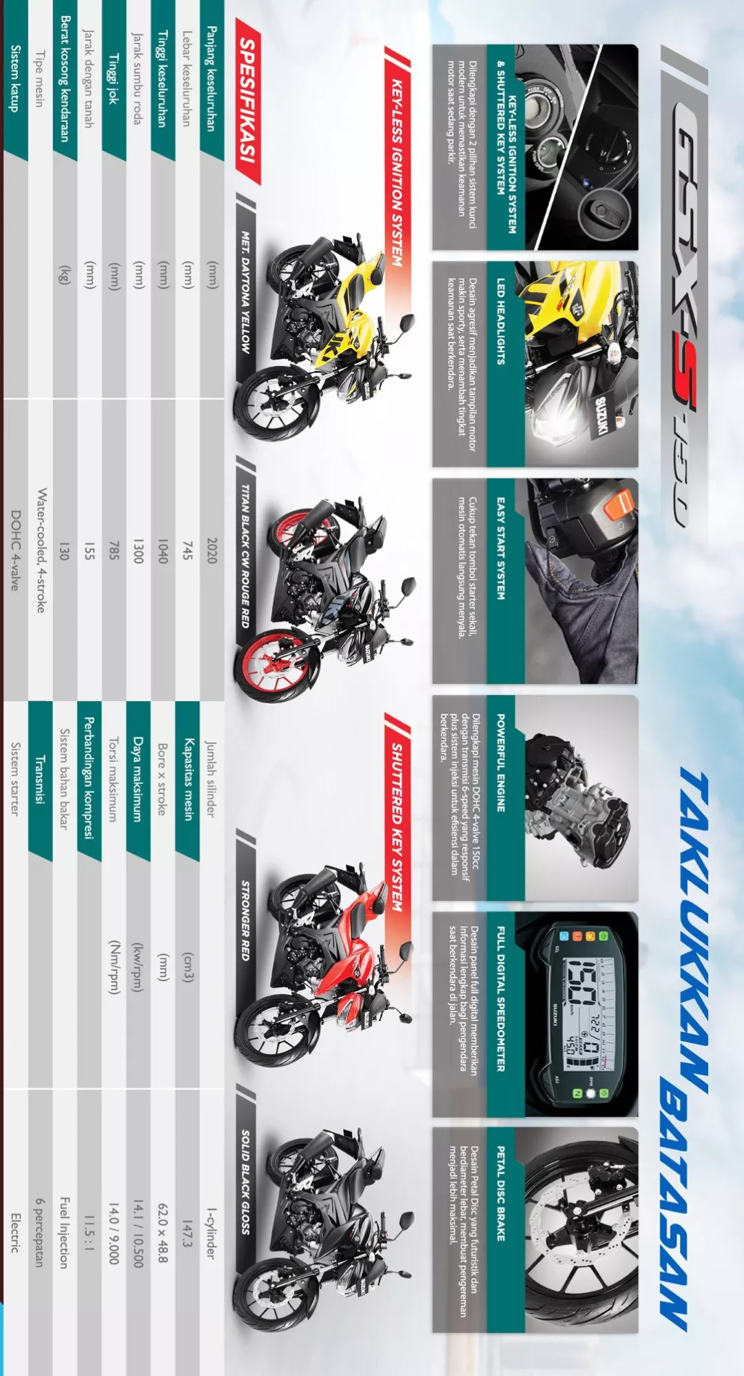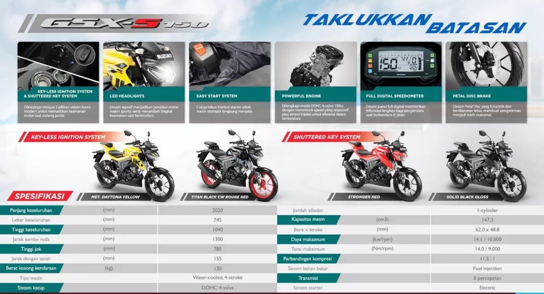 印尼 Suzuki 的這臺全新 GSX150 海盜來自 GSX-R150 跑車/GSX-S150 街車平臺,實際上是相當于前、后座位放平化的 GSX-S150 街車(GSX-S150 采用了一高一低的運動化座位設計)。官方未公布新車的發(fā)動機信息,但從表面觀察,應該就是來自 GSX-R150/GSX-S150 的那副水冷四沖程單汽缸、DOHC 四汽閥發(fā)動機,缸徑、行程為 62 mm x 42.8 mm,排汽量 147.3 cc,最大動力輸出 14.1 kw(GSX-S150)。