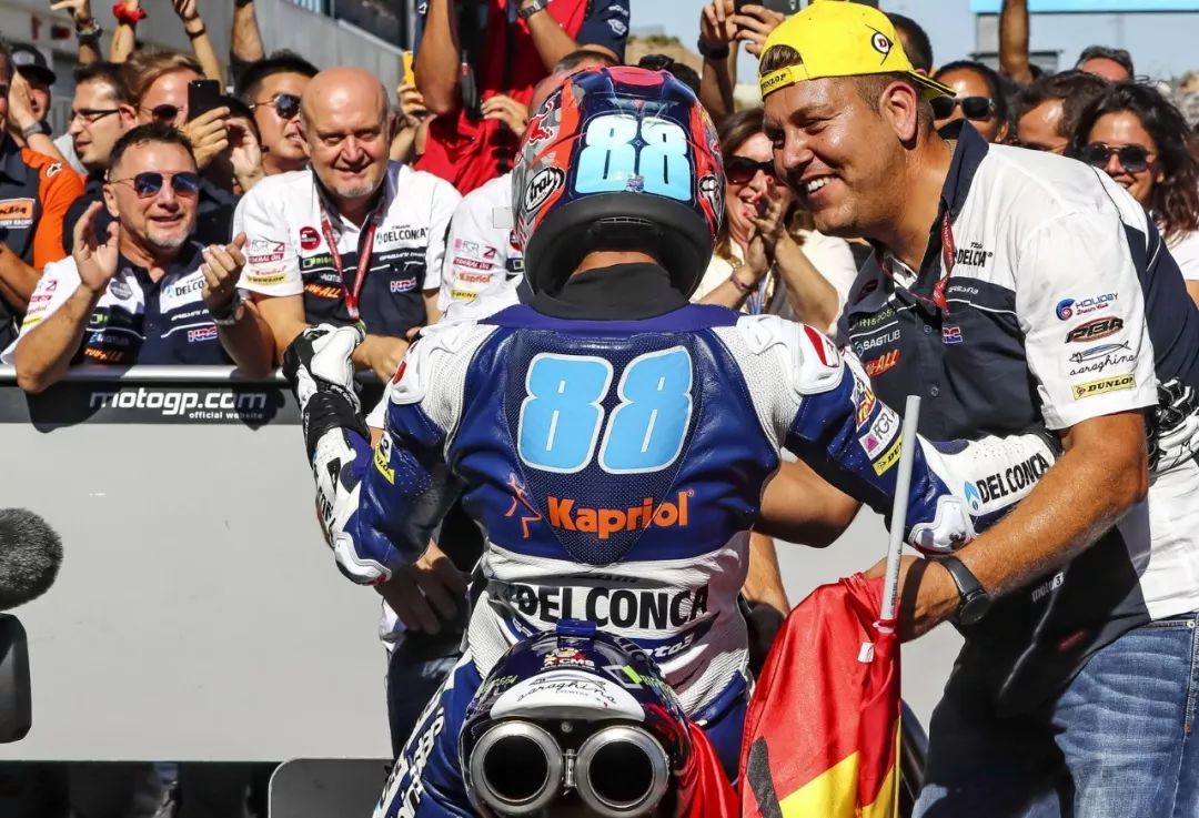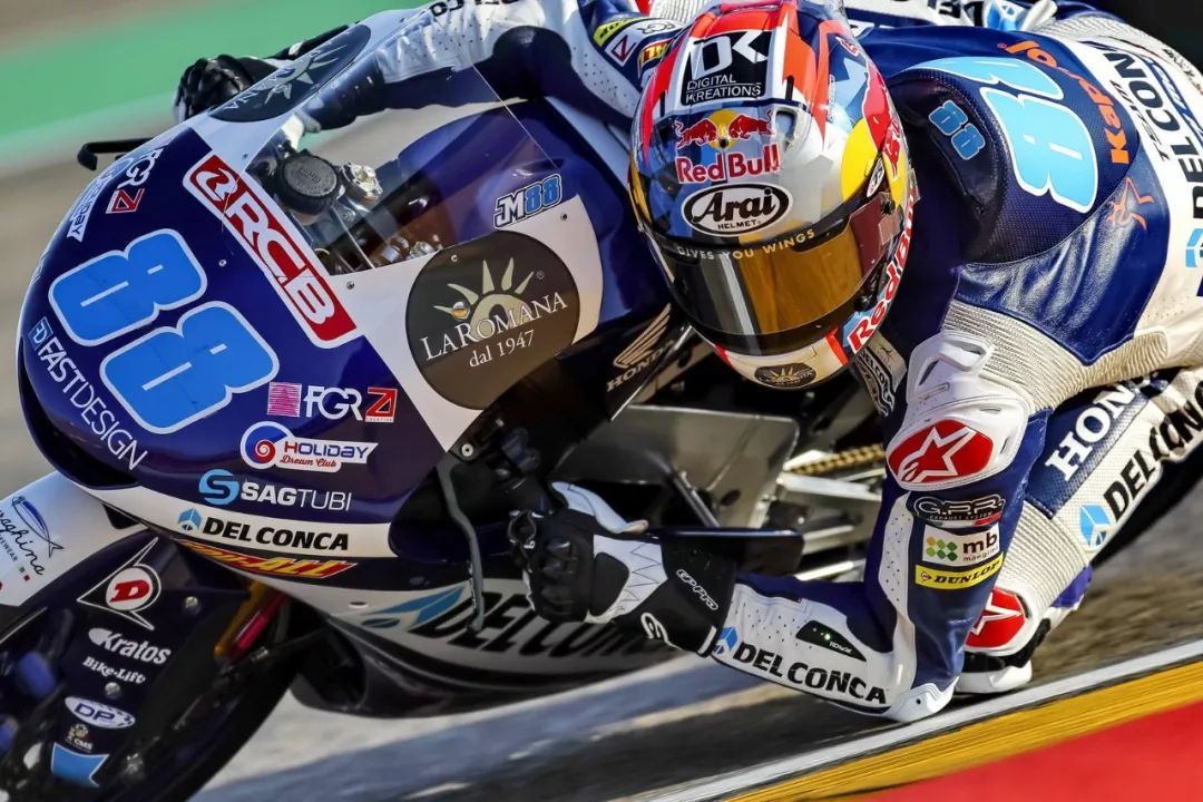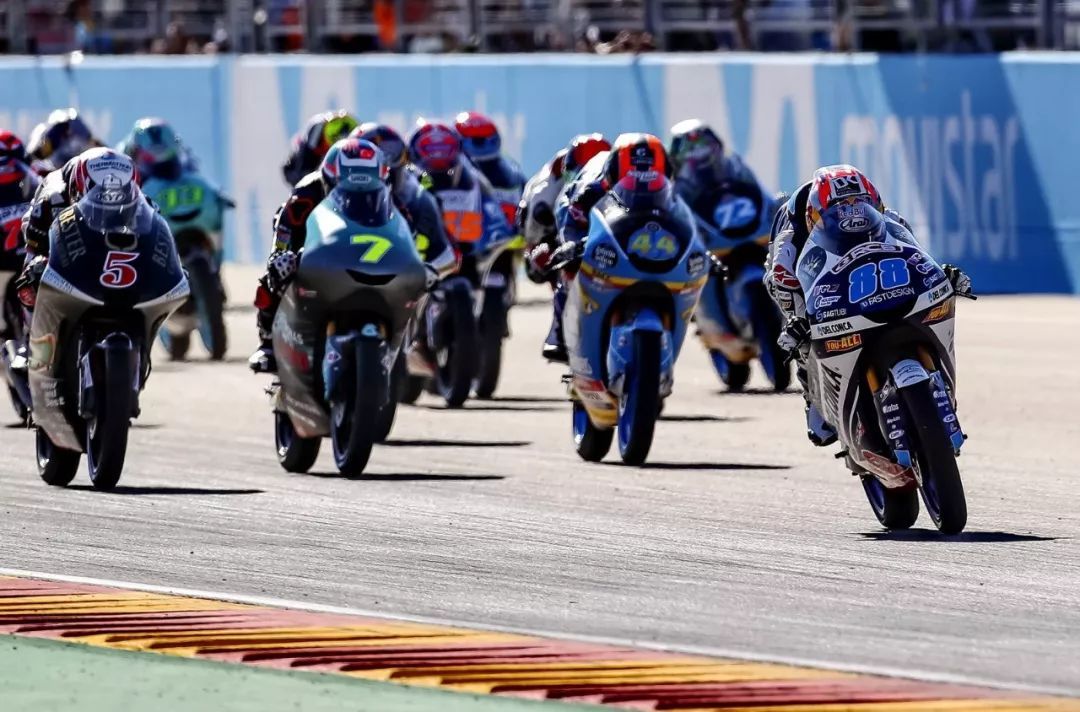 在周日的比賽開始前,多名車手由于違反賽道部分限制規(guī)定而被罰排到第十二位之后起步,其中包括了馬丁在積分榜上的兩個(gè)主要對(duì)手、 33 號(hào)車的巴斯蒂里尼(E. Bastianini,計(jì)時(shí)練習(xí)成績(jī)排第三)和 12 號(hào)車的貝澤奇(M. Bezzecchi,計(jì)時(shí)練習(xí)成績(jī)排第六),對(duì)于原本已經(jīng)在計(jì)時(shí)練習(xí)時(shí)氣勢(shì)如虹的馬丁來說,無疑就是一大的助力,他的隊(duì)友吉南托尼奧也從原本的第四排起步、提升到第二排起步。