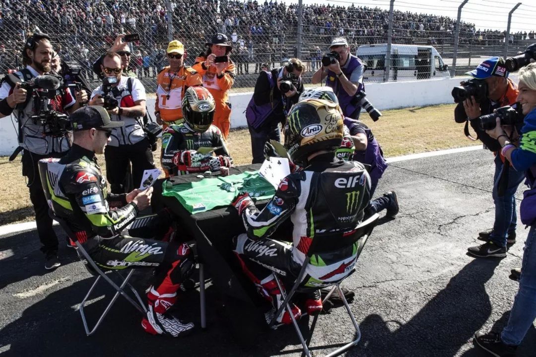 在比賽結(jié)束、跑道解封之后,雷亞在跑道邊組織了一桌牌局,以紙牌對(duì)抗他自己的三個(gè) “ 另類自我 ” 來慶祝他的新總冠軍。而另外的三個(gè)他,分別穿戴著從 2015 年開始的、雷亞在 Kawasaki 車隊(duì)中不同賽季的賽車服和頭盔。