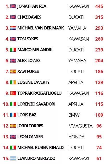 下圖:2018' WSBK 法國站第一節(jié)比賽之后的積分榜。