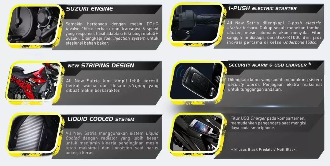 與年初時(shí)候發(fā)布的版本相比,新的 Satria F150 采用了多個(gè)新設(shè)計(jì)的車身圖案,部分版本的發(fā)動(dòng)機(jī)側(cè)殼、從之前使用的金色,現(xiàn)在統(tǒng)一換成了黑色。