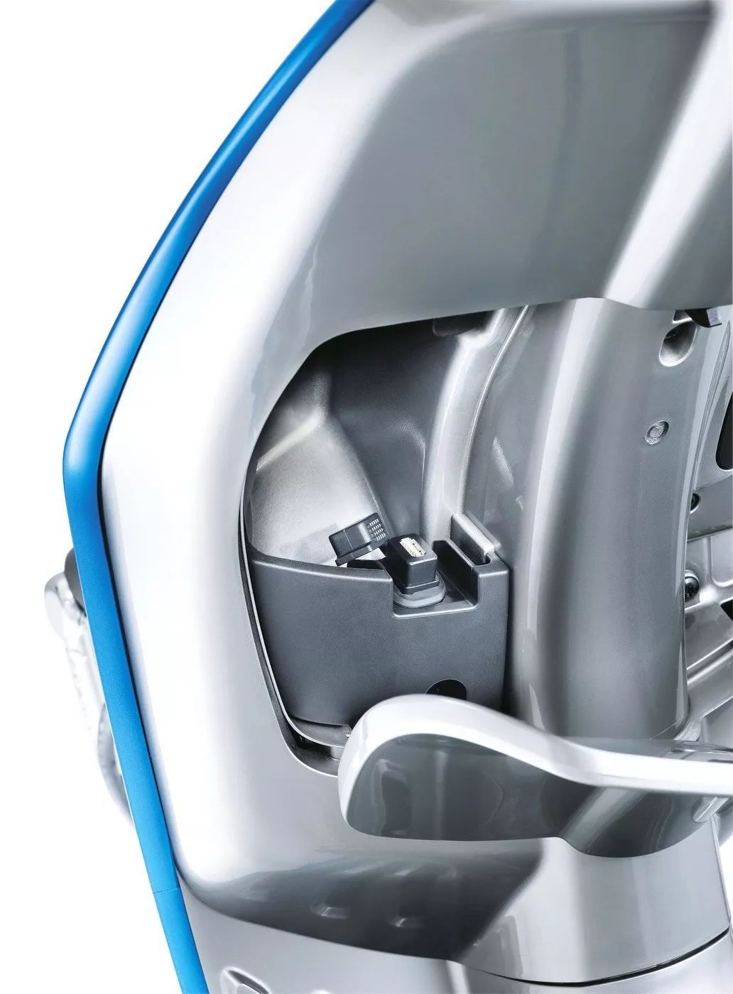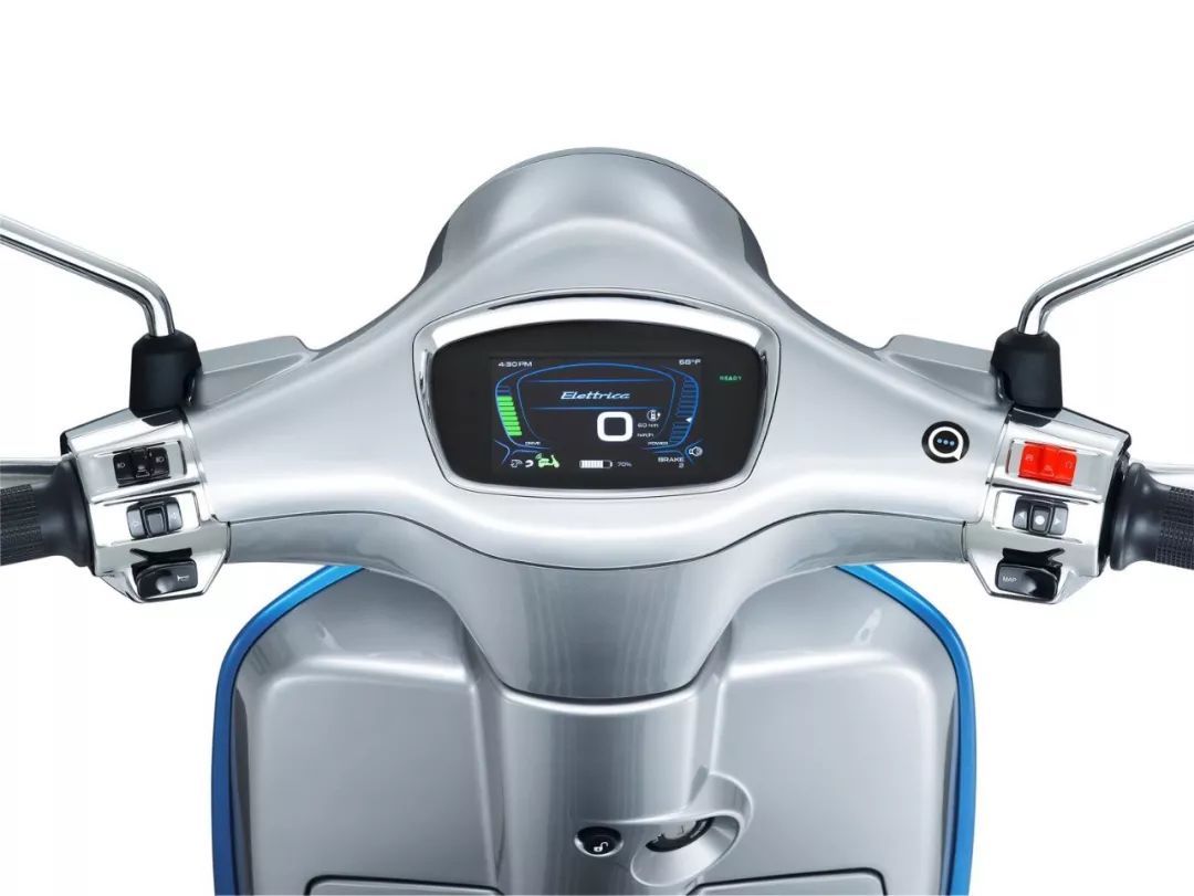 這臺偉士的 Elettrica 以一個峰值功率為 4 kw 的電機作為動力來源,配備最大續(xù)航力大約為 100 公里的鋰電池,使用普通的家用電源接口進行充電,實現(xiàn)完全充電所需要的時間大約是四小時。