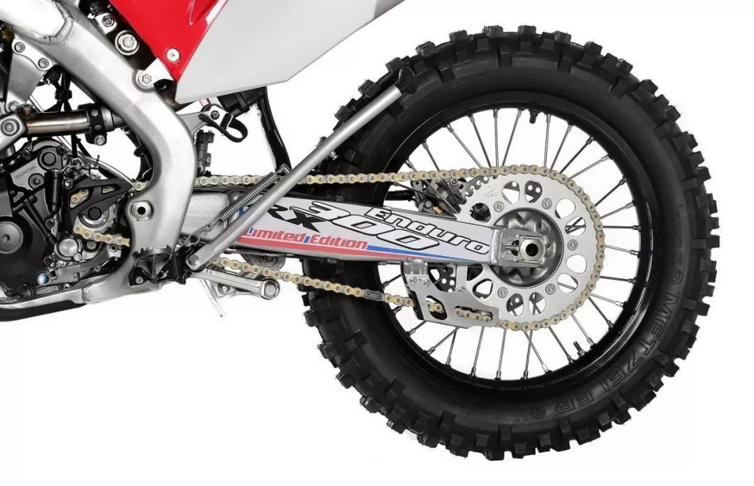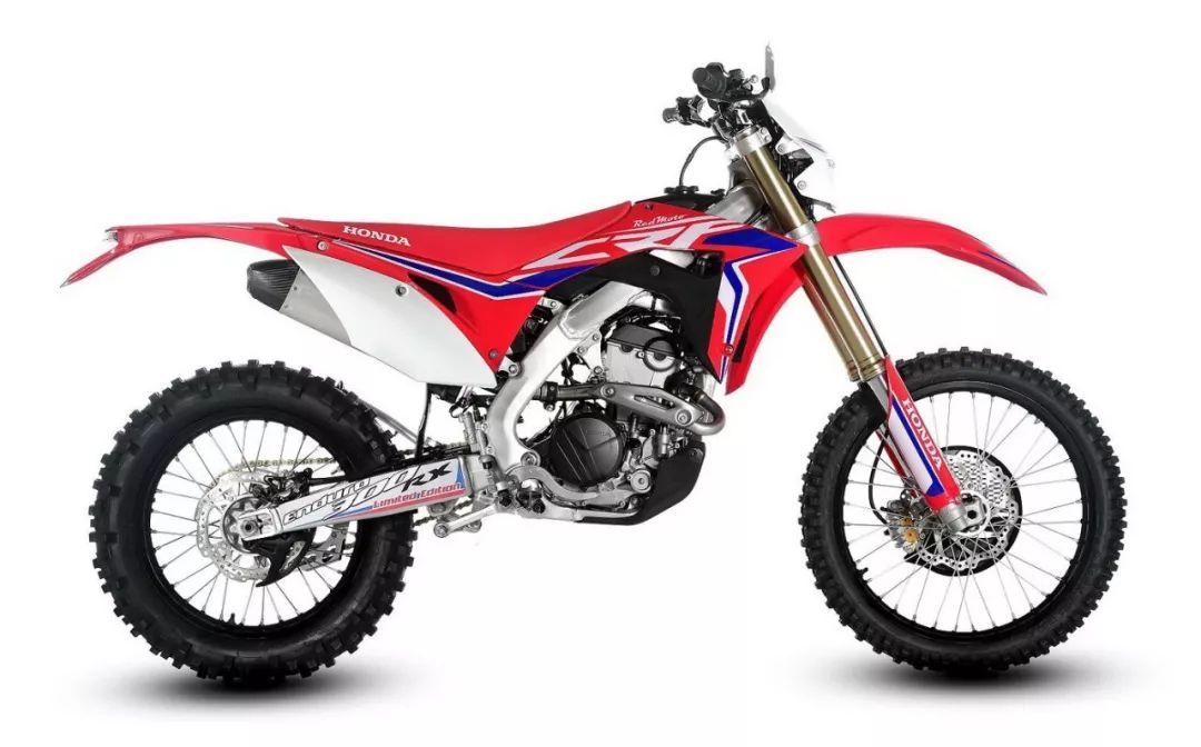 車體方面,與 CRF250R 大致相同,鋁合金闊面車架、粗壯的倒立式前叉。而加裝的前大燈、后剎車燈,是 Enduro 耐力越野的常見裝備。此外,有一個獨特的車身圖案、黑色的前后輪框,是這臺限量版的賣點之一。