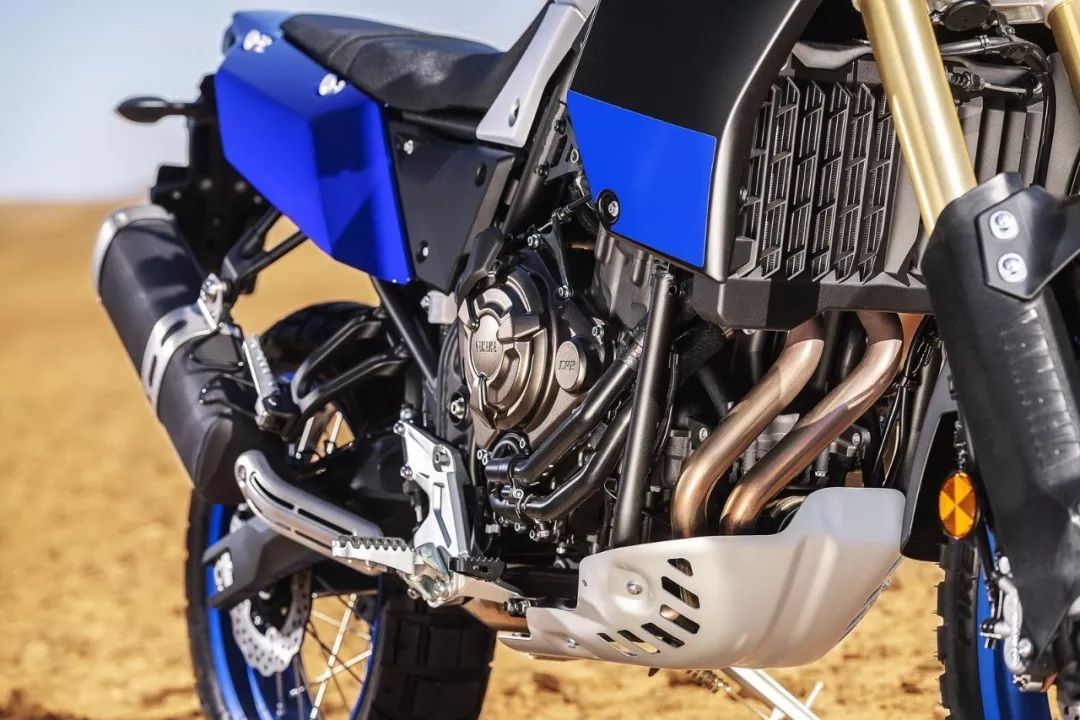 這臺全新的 XTZ 700 搭載一副來自街車 MT-07 的水冷四沖程直列兩汽缸、DOHC 每汽缸四汽閥的 CP2(Cross Plane,十字曲軸)發(fā)動機,缸徑、行程為 80 mm x 68.6 mm,排汽量 689 cc,六檔的變速齒輪箱,最大動力輸出 54 kw(約 73.5 匹。街車版的 MT-07 最大動力輸出為 55 kw/ 約 74.8 匹)。