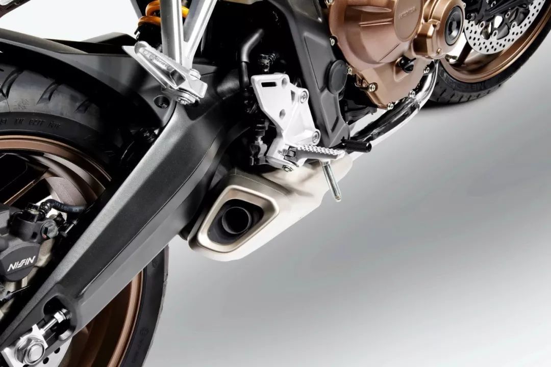 車體方面,采用一副新設(shè)計(jì)的鋼制鉆石型車架、合金后搖臂,整個(gè)底盤結(jié)構(gòu)比現(xiàn)行的 CB650F 輕了 6 公斤。整體的外觀造型是家族系的、名為 Neo Sports Café 新運(yùn)動(dòng)咖啡的復(fù)古簡(jiǎn)約主義風(fēng)格,容量為 15.4 公升的新外形油箱、短而粗的尾部,并將外露的發(fā)動(dòng)機(jī)缸蓋、兩側(cè)的曲軸箱外殼作了青銅色處理。