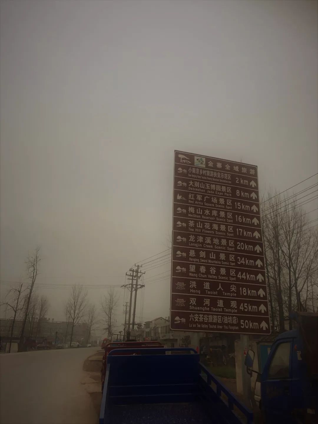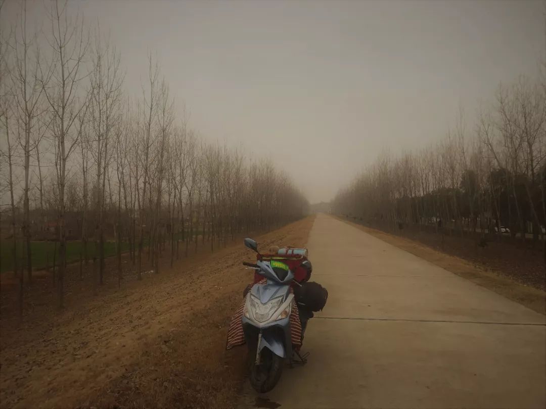 徐州出發(fā)后的這段路很無(wú)趣。霧霾下的皖北大平原風(fēng)景單調(diào),到處灰蒙蒙的毫無(wú)看點(diǎn)。淮北境內(nèi)常遇到破路,大貨車(chē)咣咣巨響卷起塵煙,一車(chē)一人兩只狗,都是灰頭土臉……