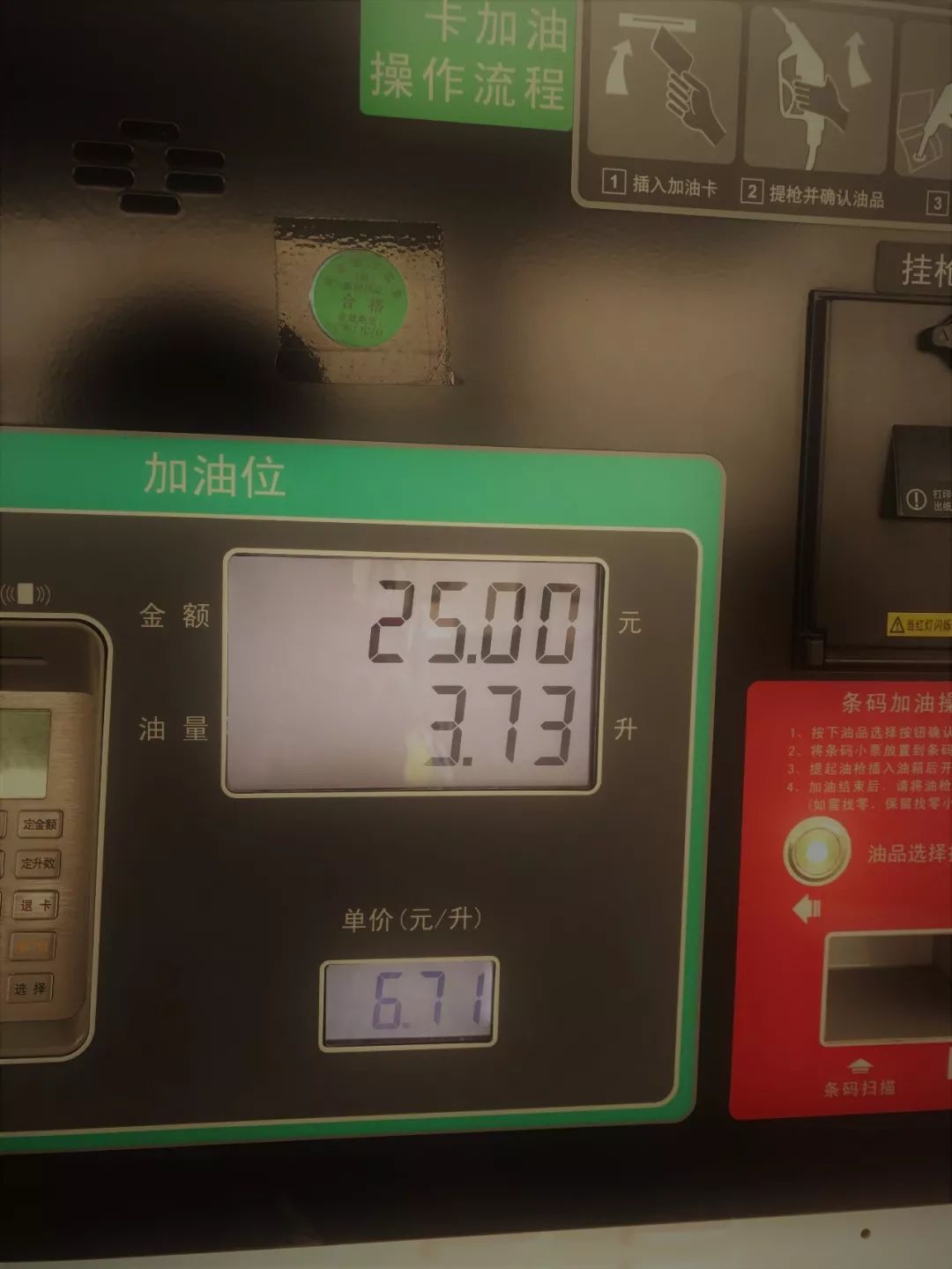 12-過(guò)潁上謝橋鎮(zhèn)街道,看到省道左側(cè)有家中石化的加油站。算了下里程,從昨天加過(guò)油到現(xiàn)在,跑了近170公里,決定加滿(mǎn)油箱。這是跳槍時(shí)的顯示。同是92#汽油,昨天160多公里加了24.9元,今天里程稍多些加了25元、3.73升。這款新本的電噴踏板車(chē),真省油!