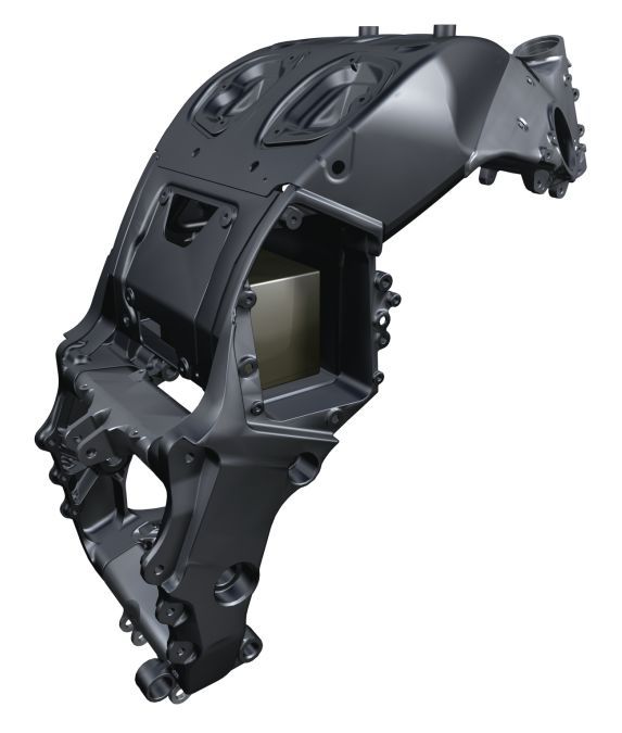 車架同樣是全新設計,目標是獲得精確、爽快的操控響應。針對熱血澎湃的并列四缸,雅馬哈優(yōu)化了鋁合金雙梁車架,并通過4個點把發(fā)動機作為強化單元緊緊擁抱;上桁架結(jié)構的鋁合金后搖臂,具有異乎尋常的強度,以駕馭200馬力;副車架則采用了鎂合金,目標是高強度、輕質(zhì)量。