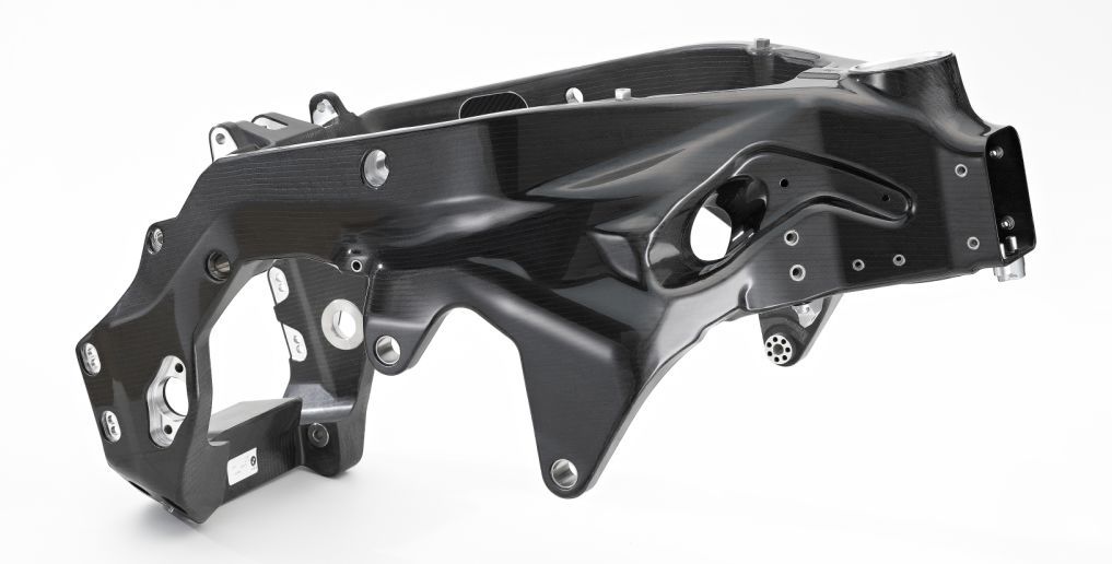 與強化動力形成鮮明反差的,則是進一步減輕質(zhì)量,凈質(zhì)量被削減至不可思議的146kg!要知道,這一數(shù)值甚至比競逐WSBK的賽車還輕,比MotoGP賽車只重了一點點!HP4 RACE減輕重量的最大措施,是武裝上完整的碳纖維車架,這在量產(chǎn)型摩托車上首次使用。這款碳纖維車架重量只有區(qū)區(qū)7.8kg,有效降低了HP4 RACE的整車質(zhì)量。碳纖維車架采用了橋式結(jié)構,并列四缸發(fā)動機前傾32°后,與其緊固鎖定,成為車架的強化單元。這具碳纖維車架,匹配了由FGR300倒叉+TTX單筒減震器構成的奧林斯賽車懸掛系統(tǒng),實現(xiàn)了異常犀利的車架性能,輕盈精準,賦予騎手出類拔萃的操控體驗!