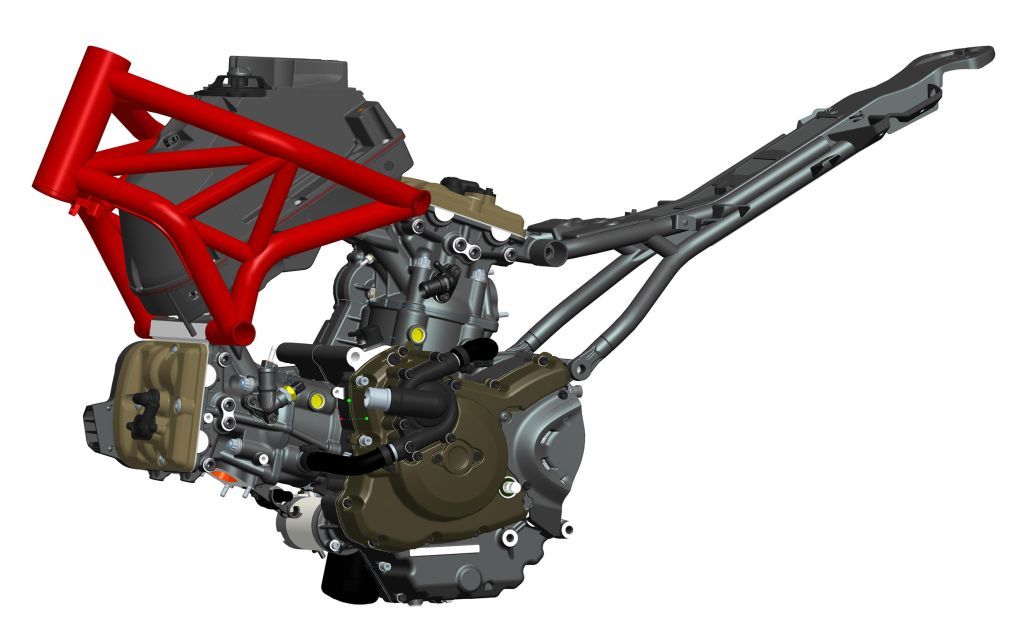 阿普利亞賽車在征戰(zhàn)世界滑胎車錦標賽時很有競爭力,殺手锏之一就是操作靈敏、掌控高效的車架。Dorsoduro 900的車架采用了鋼管+鋁合金側(cè)板混合結(jié)構,這種“雜交”車架具有重量輕、剛性強的優(yōu)點,其中擁抱汽缸、連接轉(zhuǎn)向頭的上部車架是纖巧的鋼管格子結(jié)構,擁抱曲軸箱部分的下部車架則是高剛性鋁合金板材,兩者通過高強度螺栓牢固鎖在一起。針對從750mL擴容到900mL的V型雙缸,阿普利亞工程師相應增加了車架整體剛性,以有效駕馭動力。