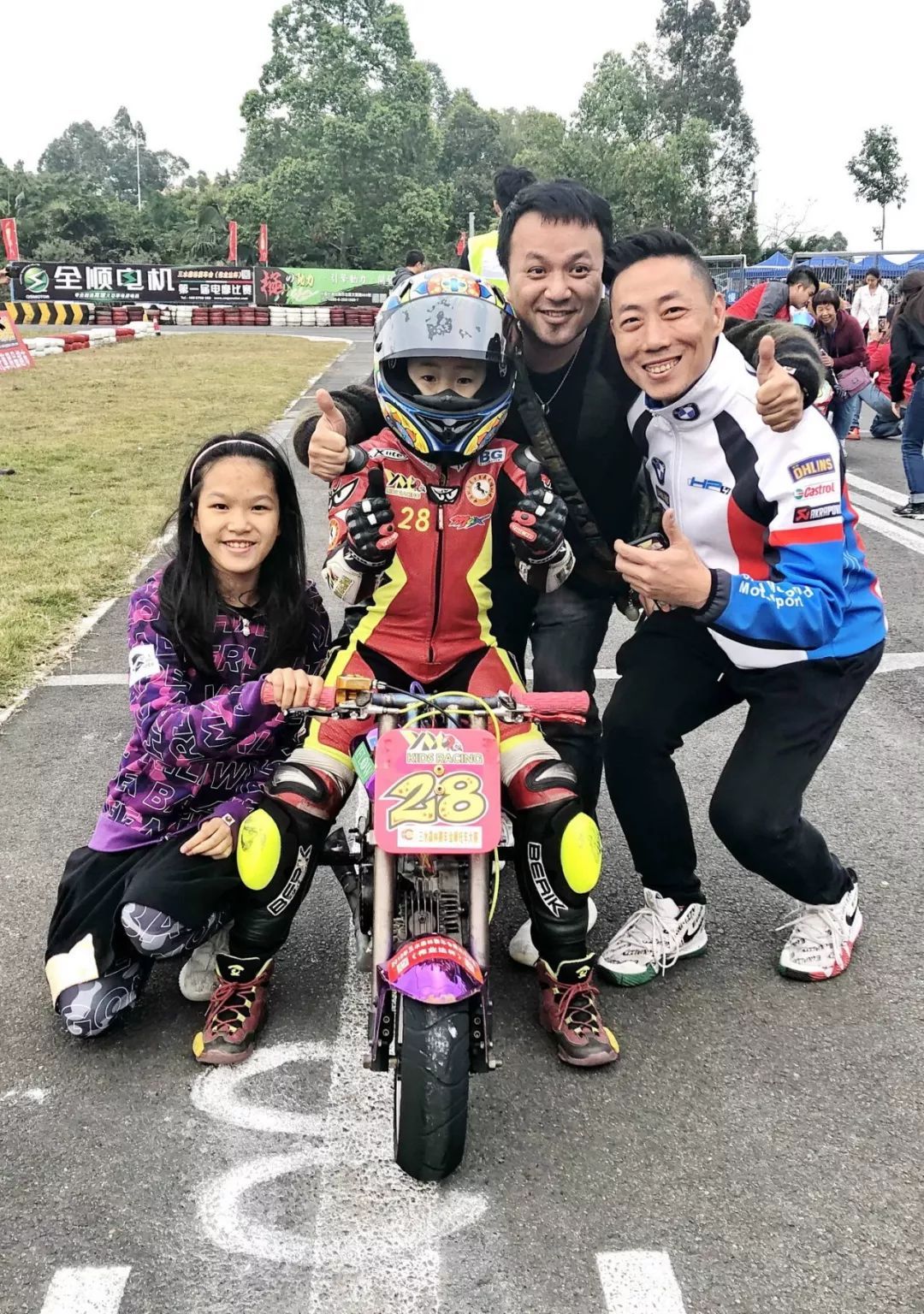 當(dāng)我真正參與摩托車運動以后,我非常了解這項運動的危險性的,但危險因素是可以有效控制的。像我們的小朋友都是使用最高標(biāo)準的安全裝備去玩車的,在少兒階段練習(xí)比賽、都是幾十公里的時速在賽道中跑,但穿戴的裝備與專業(yè)車手200多公里時速之下的裝備一樣,這個是足夠的保護。另外我們要求他們只在安全的封閉賽道上練習(xí),這個也最大限度地保障安全。小朋友自身技術(shù)會有從慢到快、循序漸進的一個過程,比一般到了成年之后才開始去跑賽車安全了很多、很多。當(dāng)然所有運動都是有一定危險性的,但賽車不一定會比其他運動有更高風(fēng)險。