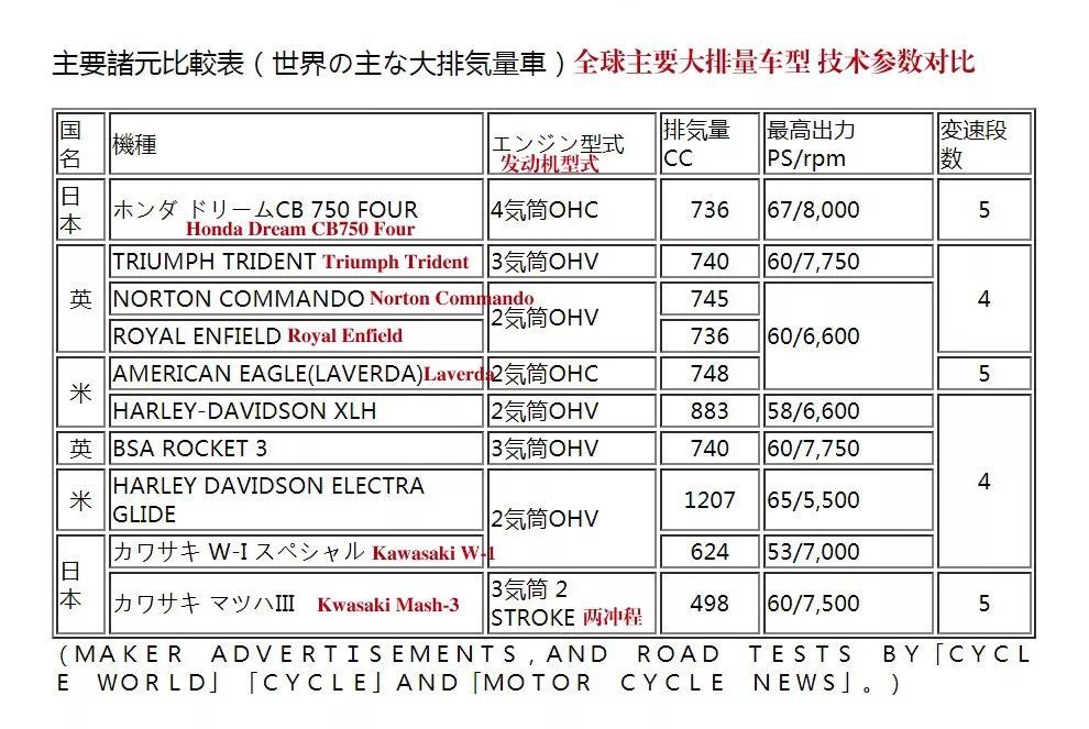 下圖,Honda 在當(dāng)時做的、歐美主要在售大排量車型技術(shù)參數(shù)對比。