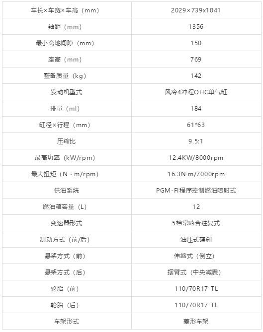 在性能方面,采用了高輸出、低震動的全球首發(fā)的New Honda 184mL發(fā)動機,動力性能更強勁,142kg的輕盈車身賦予了騎手在比賽中與250mL車型同級別的加速快感,實現了駕駛樂趣十足的動力性能。從參數表能夠得知,國四CBF190R在動力上有小幅提升。