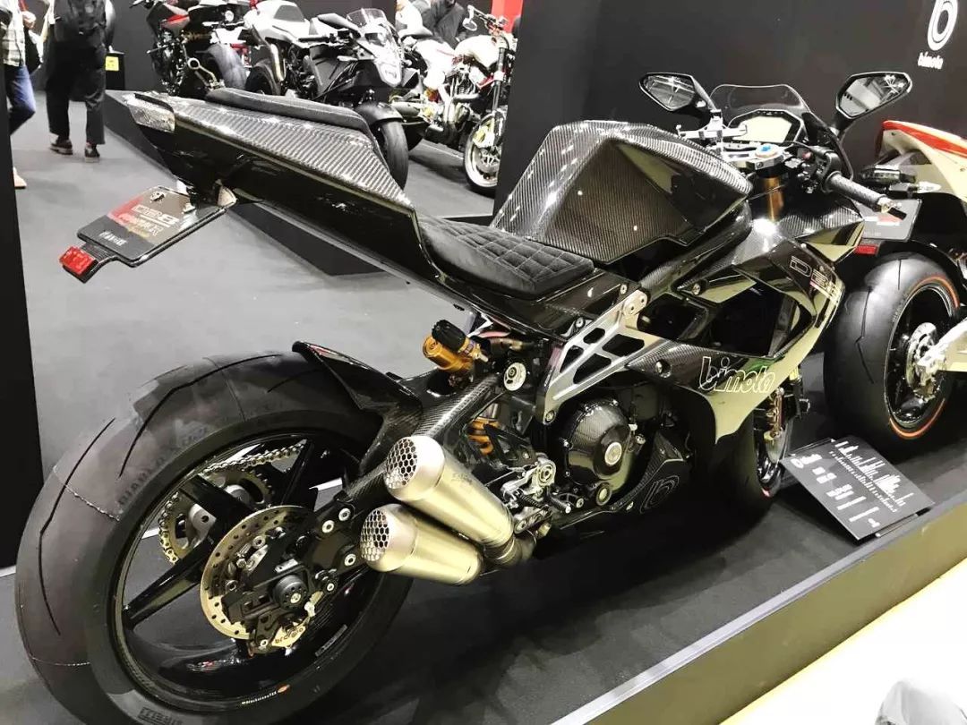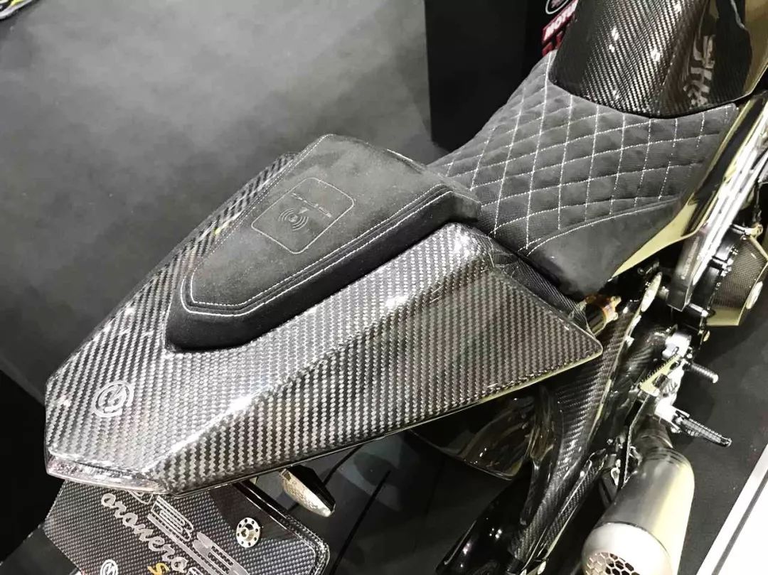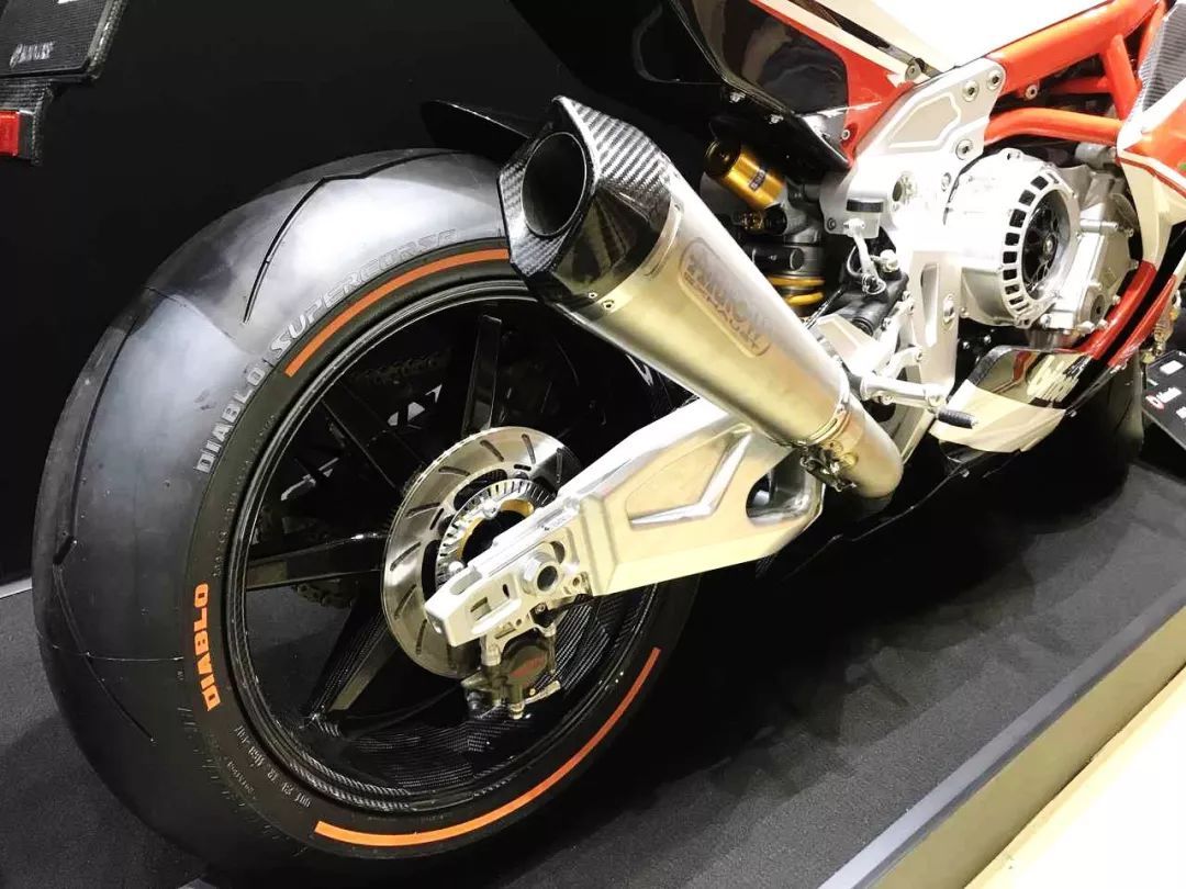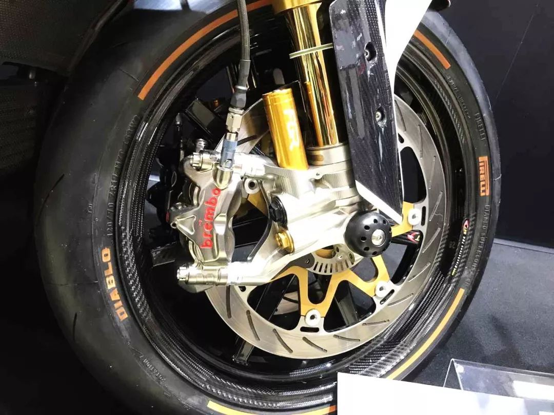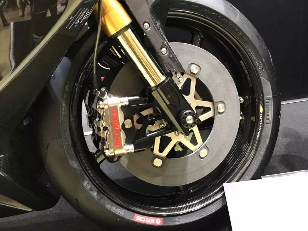 同場(chǎng)展示的、還有廠方的另一個(gè)系列車(chē)型 DB8 Oronero CR(碳纖版)。DB8 是比摩塔現(xiàn)行的核心車(chē)型之一,搭載一副來(lái)自杜卡迪的水冷 L 型兩汽缸、排汽量 1,198 cc 的發(fā)動(dòng)機(jī),最大動(dòng)力輸出 170 匹。車(chē)體同樣采用一副比摩塔自行開(kāi)發(fā)的車(chē)架,并大量采用了碳纖維制作而成的零件。而現(xiàn)場(chǎng)的 DB8 Oronero CR 展示車(chē),更是采用了碳纖維制的前剎車(chē)碟。