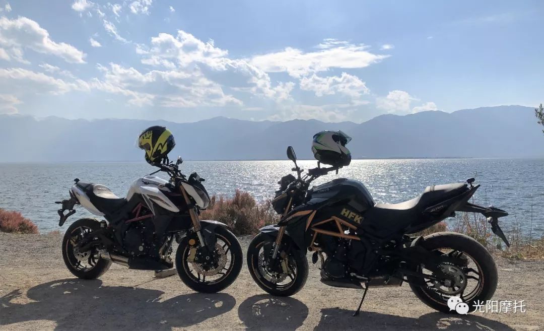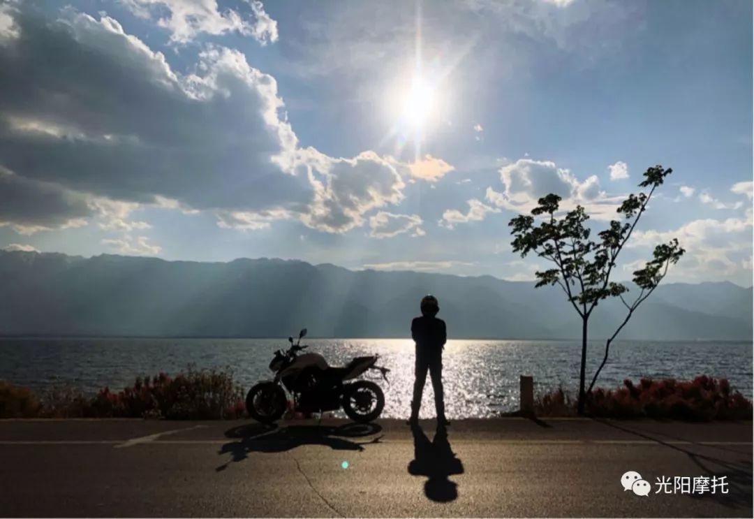 在網(wǎng)上檢索得到洱海長約42.58公里,東西最大寬度9.0公里,湖面面積256.5平方公里,導(dǎo)航顯示環(huán)湖一圈大概有八十公里良好的路面。今天天氣晴朗,眾多交通工具齊聚環(huán)島,這可能是一路上最合適測試街車性能的一天。