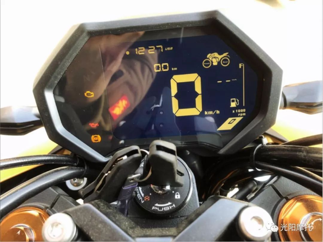 從開始KRIDER400給我的好感,除了熟悉的發(fā)動機聲音,最為直觀的就是車上安裝有一塊深藍底色顏值超高的可以顯示胎壓、電瓶電壓、溫度的表盤。