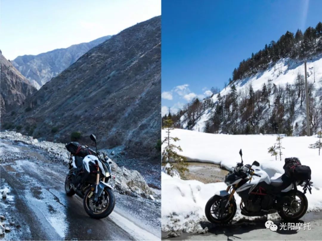 由于連夜的雨雪導(dǎo)致山體滑坡,山路直線、彎道隨處可見的的積雪和落石,一定程度上增加了騎行的樂趣。