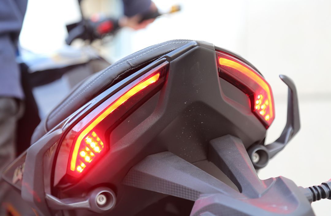 KRider 400全車采用LED燈光,三角形車頭上的燈組以V字形排列在下方,兩個近光燈和兩個遠光燈呈左右對稱分布,為折射式大燈,鋪路效果和亮度都非常讓人滿意。值得一提的是,KRider 400采用了長明燈設(shè)計,這在國產(chǎn)車中并不多見,啟動后近光燈和尾燈自動亮起,不可關(guān)閉,提高了車輛在道路上的辨識度。車頭頂部還有一個小的三角形定位燈,當外側(cè)遠光燈亮起后,配合螳螂狀的頭部造型,整個車仿佛活了起來,看上去炯炯有神,這樣的仿生學設(shè)計可以說是非常到位了。尾燈的設(shè)計也具有非常高的辨識度,兩條燈帶沿著車尾輪廓分布在左右,兩端點陣式的剎車燈是點睛之筆。同時前后轉(zhuǎn)向燈采用了LED流光式轉(zhuǎn)向燈,這在國產(chǎn)車中應該是首次出現(xiàn),也為車輛增色不少。