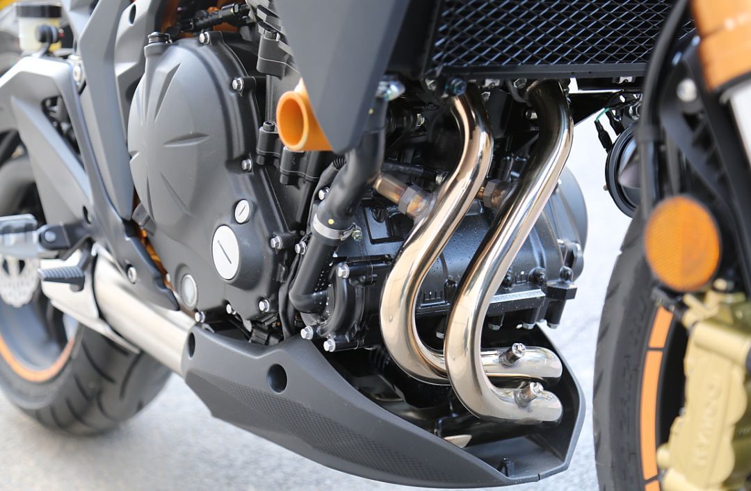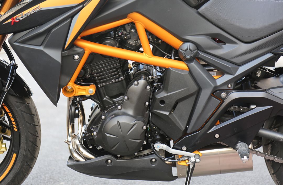 KRider 400所搭載的川崎原裝發(fā)動機是一個很大的亮點,這臺并列雙缸DOHC水冷發(fā)動機之前被應用在川崎ER4n上,排量399.1mL,最大功率32kW(44PS)/9500rpm,最大扭矩37N·m/7500rpm。這款發(fā)動機川崎已經(jīng)應用了多年,可靠性自然不必擔心。采用了博世的電噴系統(tǒng),油門響應快速但并不“神經(jīng)質(zhì)”,發(fā)力區(qū)間從五六千轉(zhuǎn)開始就能感覺到動力源源不斷地爆發(fā)出來,表顯極速可以到175km/h左右,整個加速過程非常平順,沒有明顯的突兀和段落感。KRider 400還有著運動模式和經(jīng)濟模式兩種動力模式可選,通過左側(cè)手把的動力模式選擇鍵切換,但由于這車并不是電子油門,只能通過電噴程序進行調(diào)節(jié),實際使用過程中變化并不明顯。