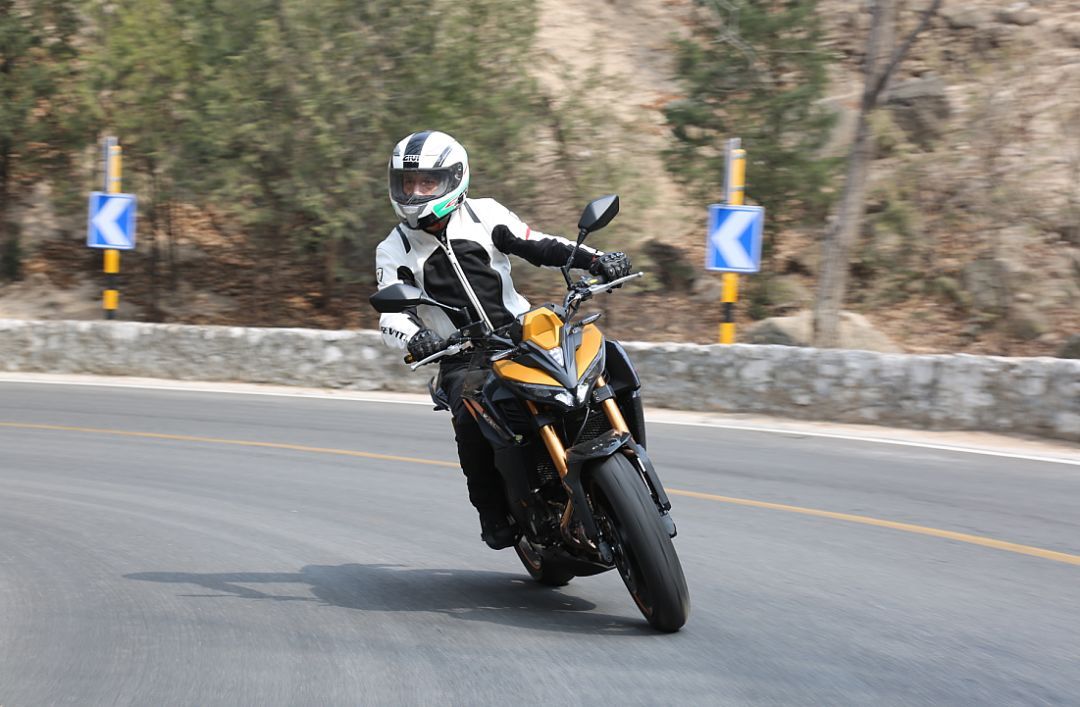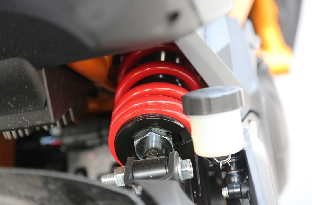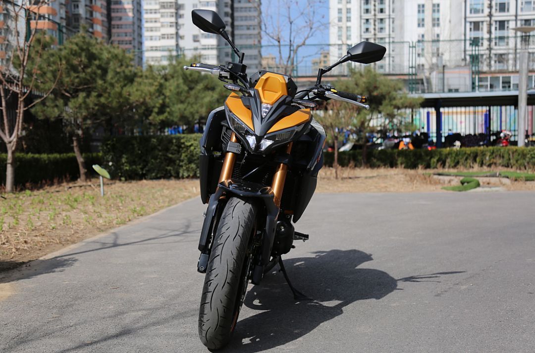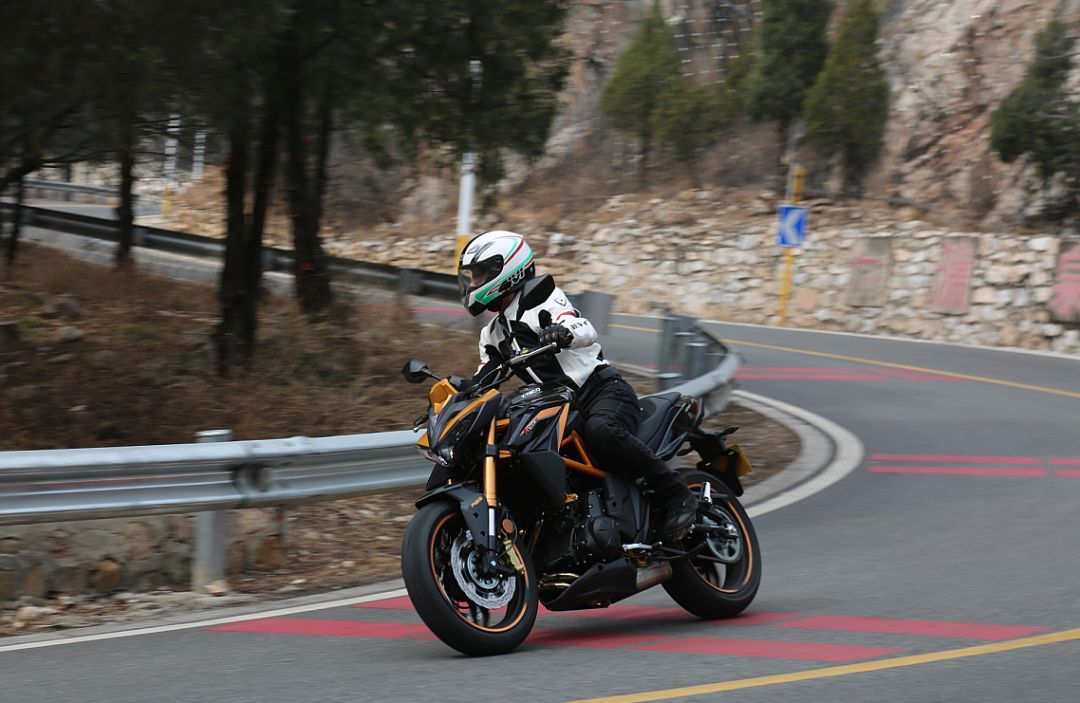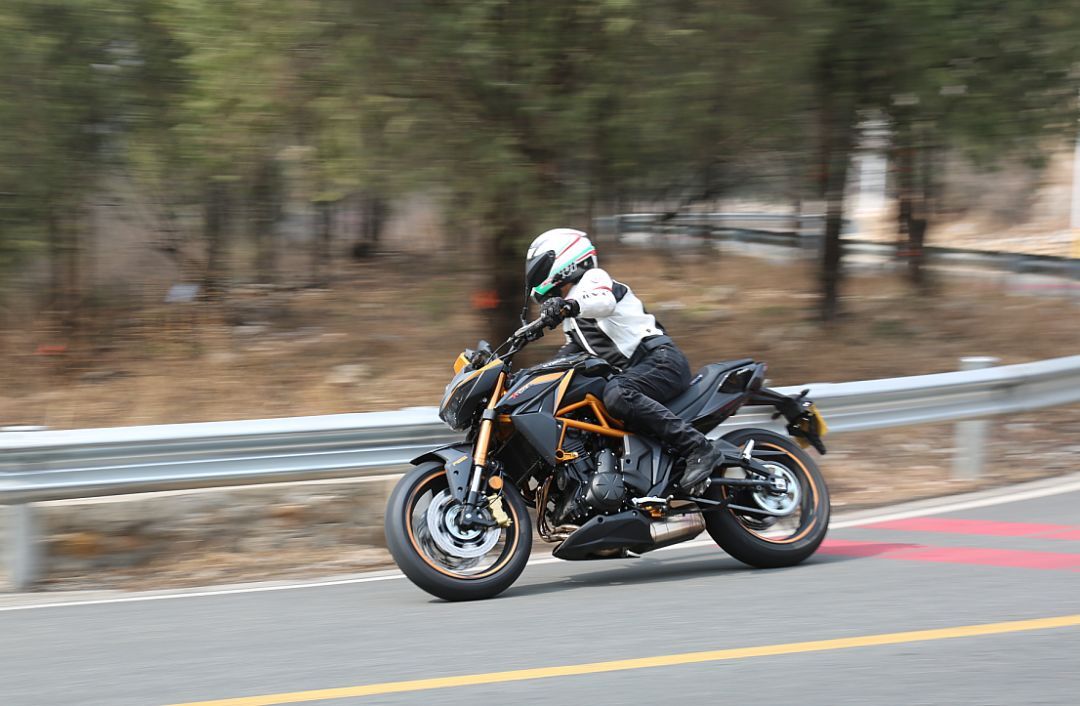 KRider 400有著粗壯的52mm倒立式前叉,采用金色涂裝,看上去是非?;H说模С诸A載阻尼可調(diào),后側(cè)置單減震支持預載七段可調(diào)。在減震表現(xiàn)上,可以很清楚的感受到這款車減震運動化調(diào)校的傾向,前后減震的預載設(shè)置都較為偏硬,像是更大排量仿賽車型的調(diào)校。在中低速時,前后減震的表現(xiàn)都非常良好。在高速激烈駕駛的情況下,前減震的回彈阻尼有些偏快,后減震的反應則稍微有些遲緩,會有一種后減震在彎中“吃”不下去的感覺,不過在絕大部分駕駛情景中,這套減震的表現(xiàn)還是不錯的。配合這套車架,總體的駕駛感受可以概括為一個“穩(wěn)”字,低速操控穩(wěn)定輕巧,不過在高速情況下進行轉(zhuǎn)向就需要施加更多的控制。