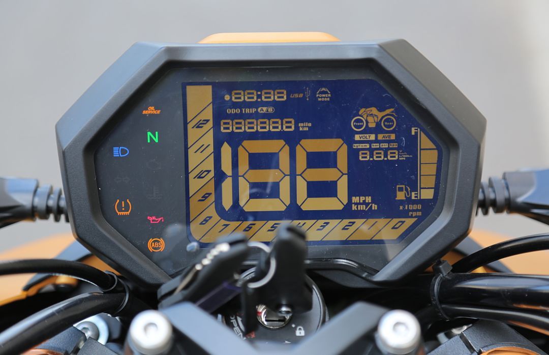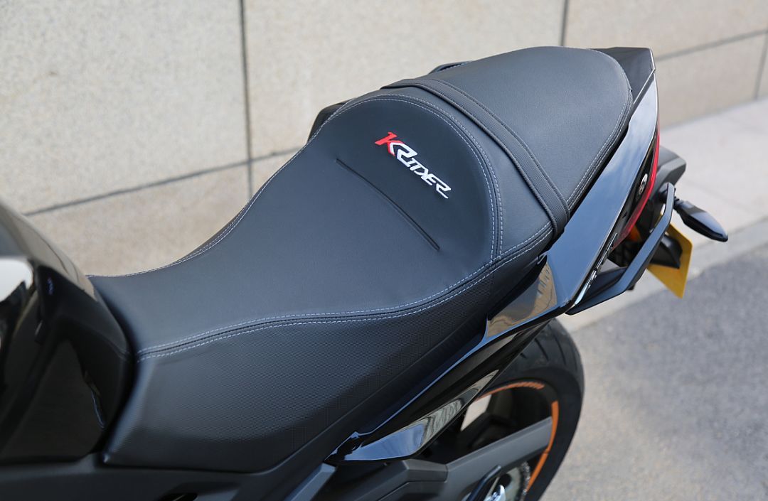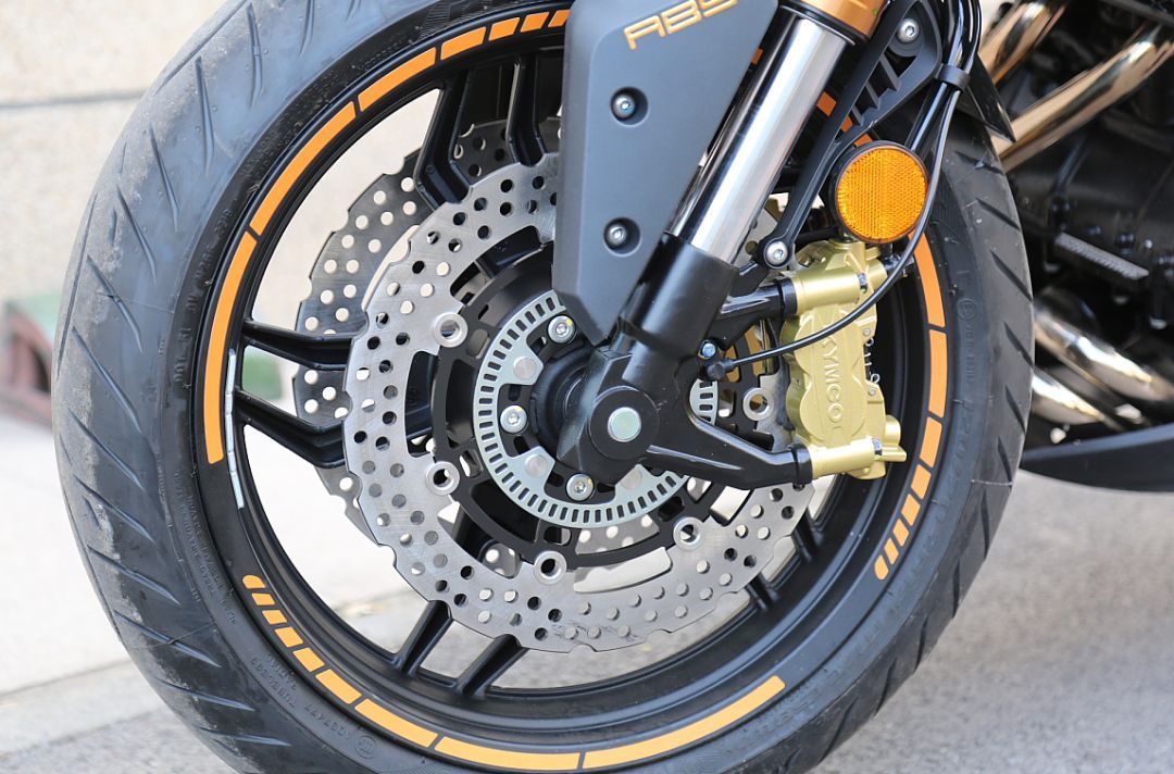 KRider 400前輪規(guī)則為120/70ZR17,后輪規(guī)格160/60 ZR17,普通版本配備的是正新公路輪胎,高配版采用了象牌Z8系列輪胎,并增加了前后胎壓監(jiān)測等功能。我們拿到的是象牌Z8輪胎的高配版,關(guān)于象牌Z8,圈子里有一句調(diào)侃的話是這么說的,“三萬公里的像一萬公里的,一萬公里的像新的。”這也從另一個側(cè)面說明Z8這套輪胎在耐磨方面真的有出眾的表現(xiàn),很適合城市代步或長途摩旅使用,在雨天時這套胎也有著獨到的表現(xiàn),但如果你想用非常激烈的方式去駕駛這輛車或者是跑山愛好者,我還是建議換一套運動性能更好的輪胎。另外高配版的胎壓監(jiān)測功能還是非常實用,不僅在啟動時會進行自檢,有異常會報警外,前后輪胎的胎壓都可以在這塊大儀表上實時顯示,行駛中如果胎壓不足也會在儀表上報警。