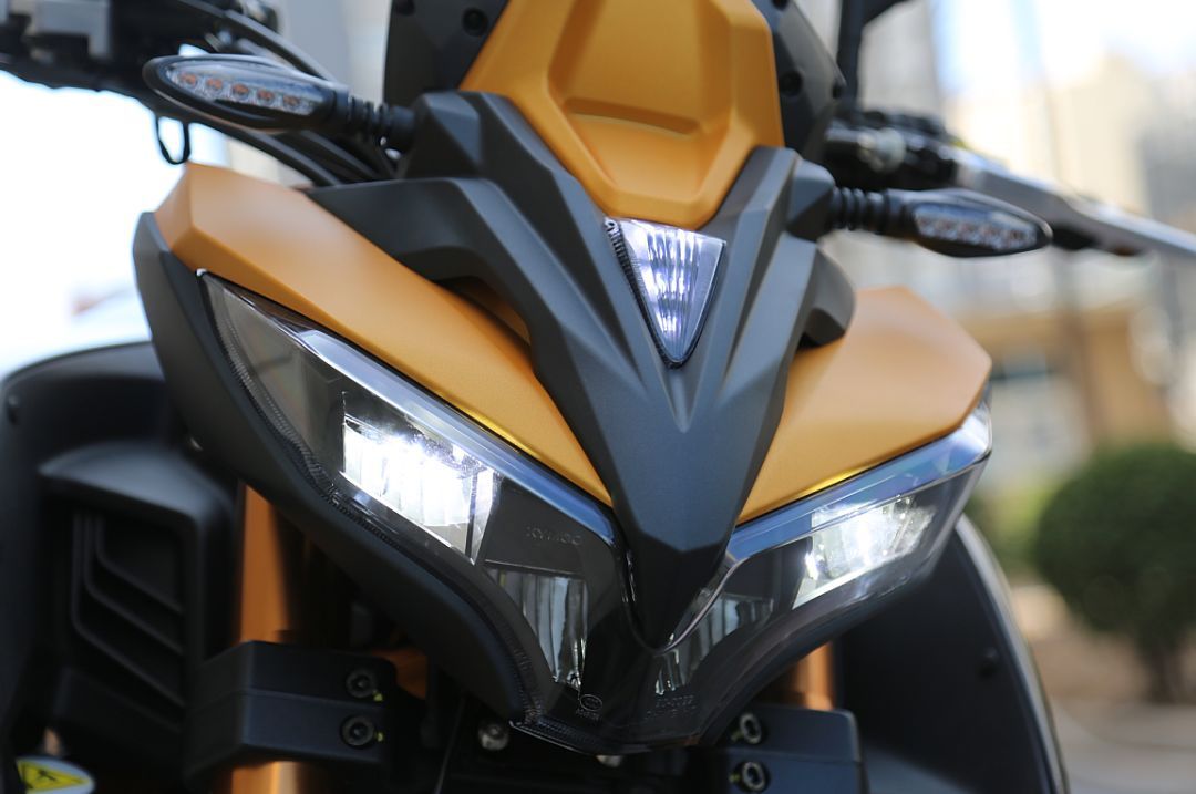 KRider 400的外觀設(shè)計非常前衛(wèi)大膽,尤其是車頭部分,仿生學設(shè)計的運用也是這輛車外觀方面最具爭議的地方,喜歡的人為它搖旗吶喊,不喜歡的人則表示不屑一顧。外觀問題太過主觀,這里不便評價,不過筆者認為這樣有些“另類”的設(shè)計并不是壞事,可以從眾多有著相似前臉的運動街車中抓住人的眼球,行駛在路上也不必擔心“撞臉”。整車外觀用了很多棱角和折線的元素,鋼管車架裸露在外,搭配著寬大高聳的油箱,給人很強的力量感。而短小精悍的底置排氣和非對稱式的鋼管后搖臂,則很容易找到川崎ER車系的影子,加上粗壯的金色倒減、前后大活塞的卡鉗、駝峰造型的后座,都能體現(xiàn)出光陽想賦予這臺車的運動氣息。