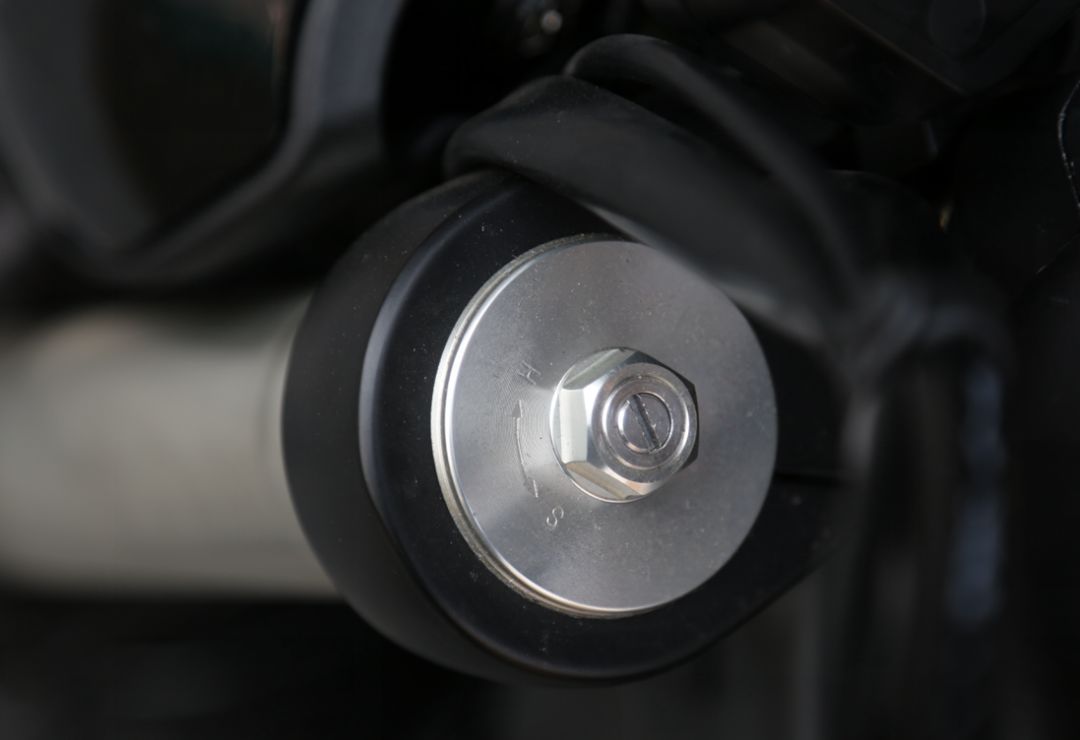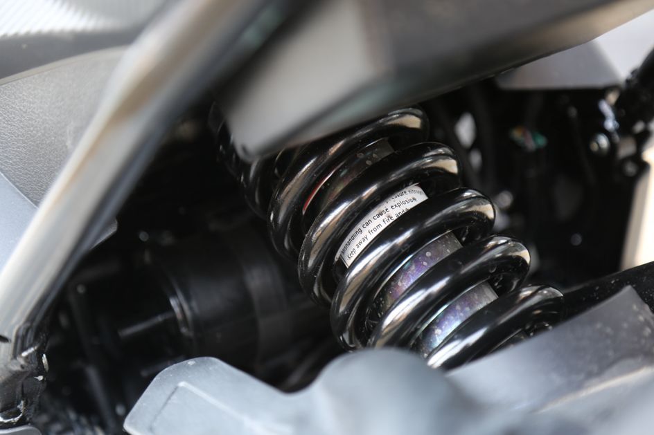 502 C高配版前后減震皆為KYB品牌,前減震多段預(yù)載可調(diào),減震行程135mm。后中置減震同樣支持預(yù)載可調(diào)。