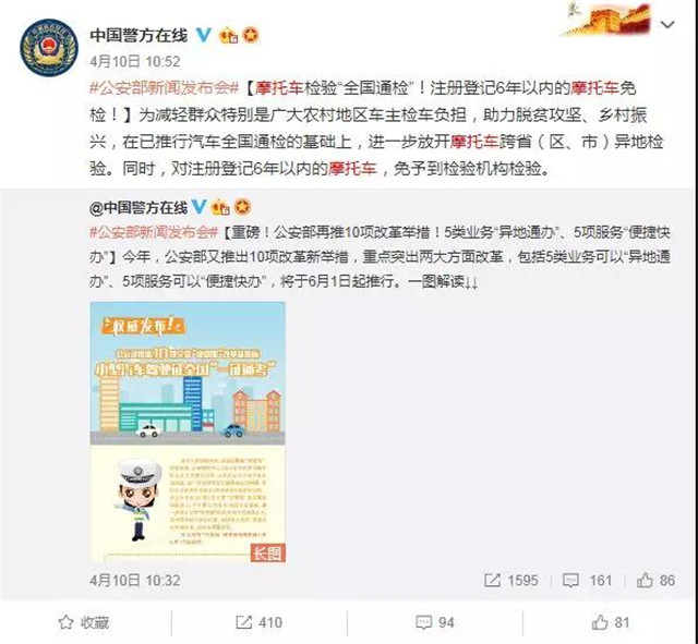 前些天公安部在新聞發(fā)布會上正式公布了有關六年內摩托車免檢的消息,同時開放了摩托車的異地檢車業(yè)務。著實為摩托車駕駛人減輕了很大壓力,也推進了和汽車的“同權”。