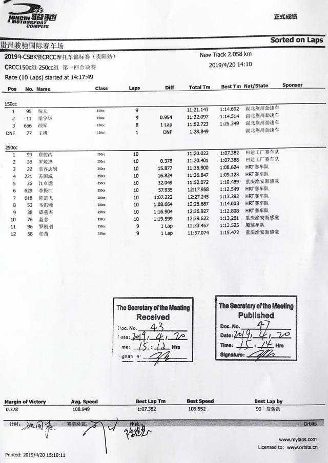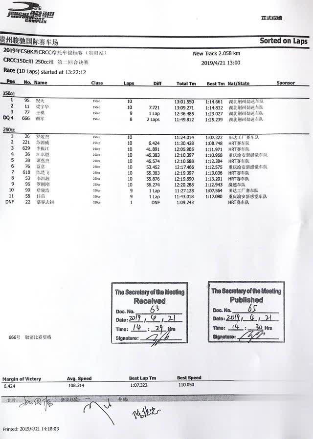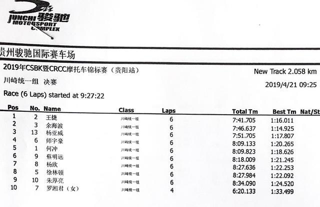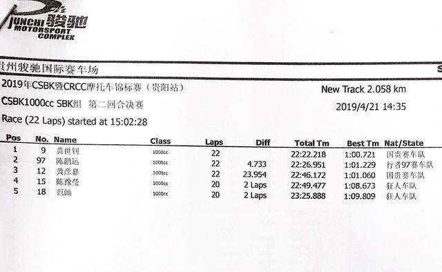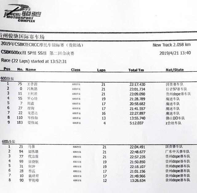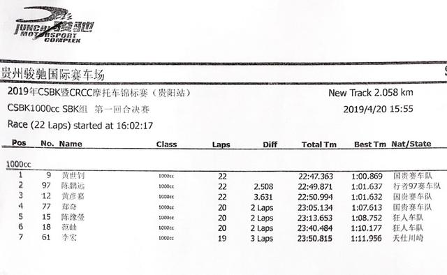 2019 CSBK暨CRRC貴陽站:各級別成績表