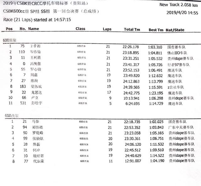 下圖:CSBK SP600、SS600 組兩節(jié)賽事成績表。