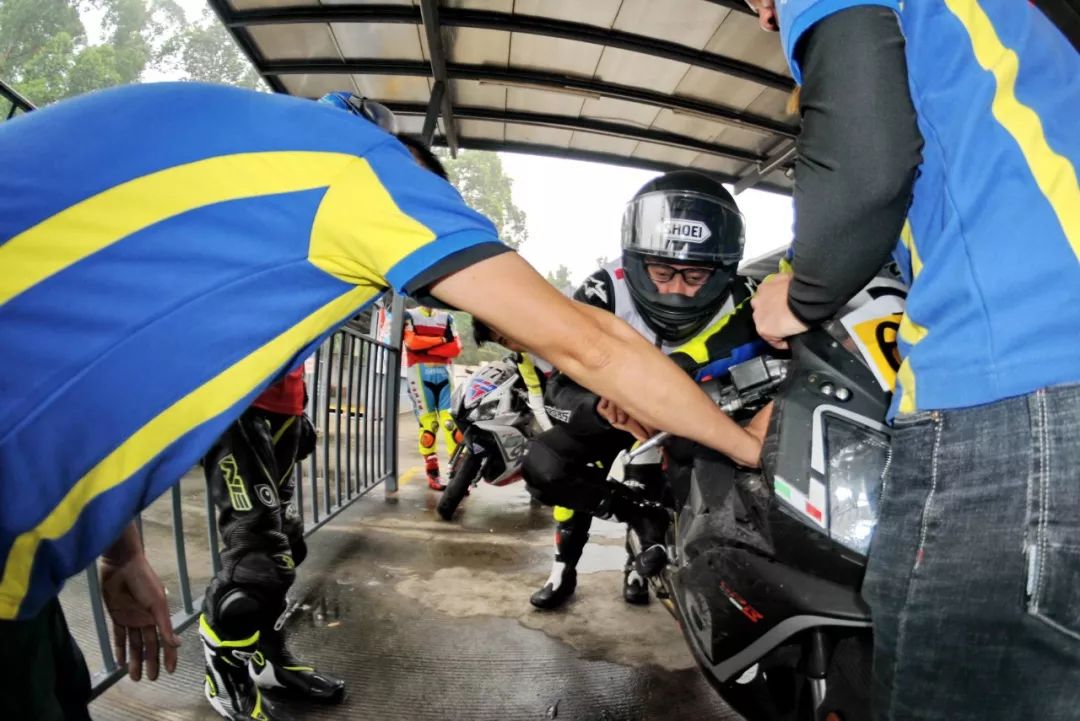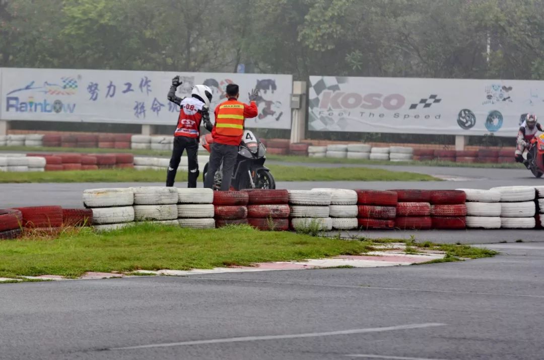 有了這幾節(jié)的帶指導(dǎo)之下的嘗試,學(xué)員們對(duì)于雨中的 “ 放飛 ”似乎適應(yīng)了下來、自信也隨之而來。而學(xué)員中、多人曾有過下賽道的經(jīng)驗(yàn),稍能控制好速度與動(dòng)作、跑起來還不太別扭。而更多的,是進(jìn)彎速度太快導(dǎo)致彎中跑大、無法順利過彎,或者是只能把彎前的速度慢下來 ... ... ... 至于各種各樣的摔,自是層出不窮。