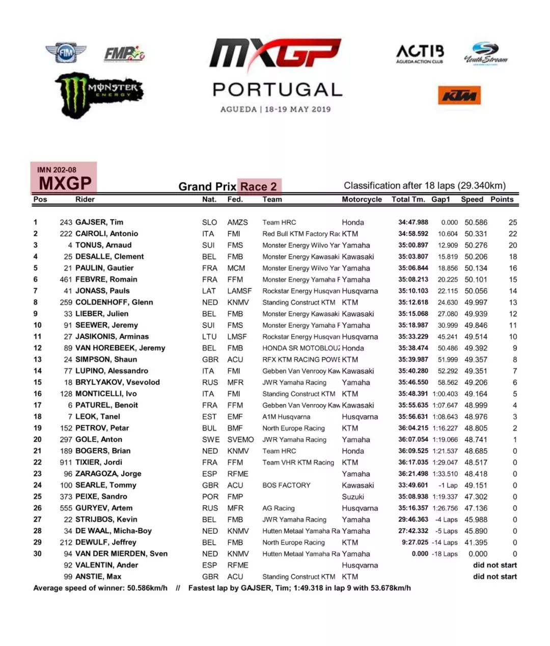 賽后,蓋沙表示,“ 在葡萄牙取得兩節(jié)的勝利、真是太好了??梢宰屛野焉蟼€(gè)周末的事情(兩節(jié)比賽都摔了車)拋到腦后。我知道如果我集中精力,我就可以在這條賽道上做得很好。盡管如此,獲得兩個(gè) MXGP 的勝利是一個(gè)很大的信心助推器,并很好地支持我在特倫蒂諾(Trentino,第四站、意大利,蓋沙在這一站比賽獲得了全勝)的勝利。下一站的法國,我對現(xiàn)在的狀態(tài)感到非常高興,并相信賽車和我一起、會工作得很好。非常感謝團(tuán)隊(duì)如此努力地實(shí)現(xiàn)這一目標(biāo),讓我們繼續(xù)努力!”