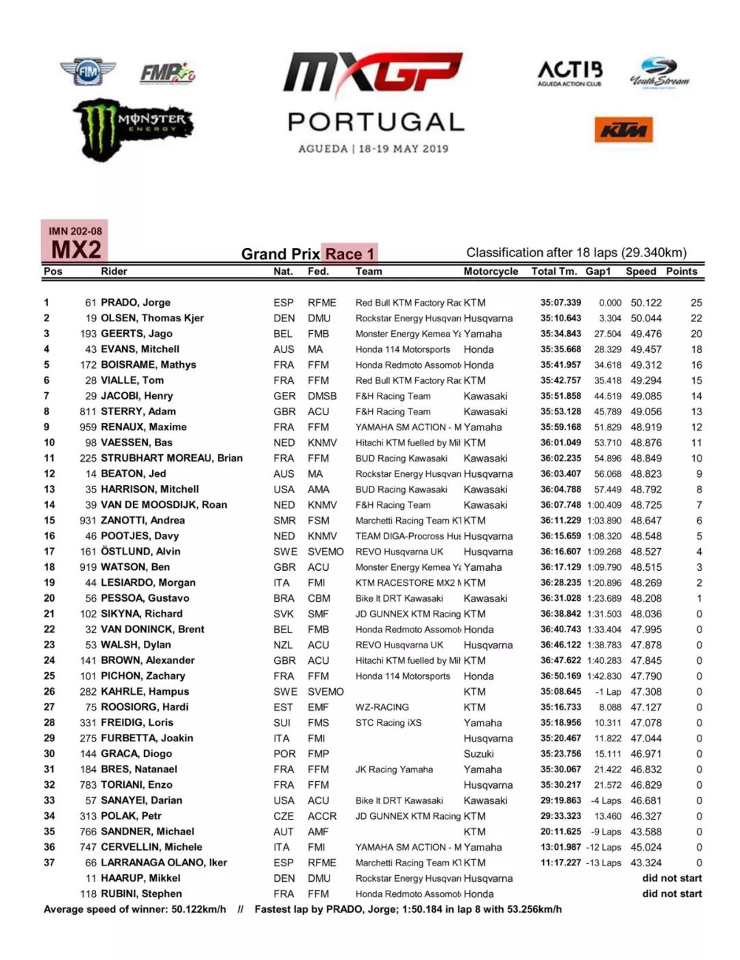 MX2 級別,駕駛 61 號車、西班牙車手普拉多(Jorge Prado)繼續(xù)以無敵的姿態(tài)存在,奪得了兩節(jié)比賽的勝利。