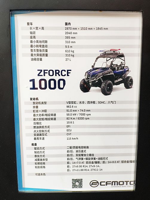 春風(fēng)Zforce1000全地形車是目前春風(fēng)UTV家族中的旗艦產(chǎn)品,搭載水冷8氣門V型雙缸發(fā)動機(jī),排量962.6mL,采用博世電噴,可以輸出60kW最大功率和86.2Nm的最大扭矩。四輪采用了可調(diào)的獨(dú)立懸掛,整車最小離地間隙達(dá)到了285mm,通過電控按鍵可以使Z1000在兩驅(qū)、四驅(qū)以及全輪差速鎖之間切換,達(dá)到更好的通過性能。