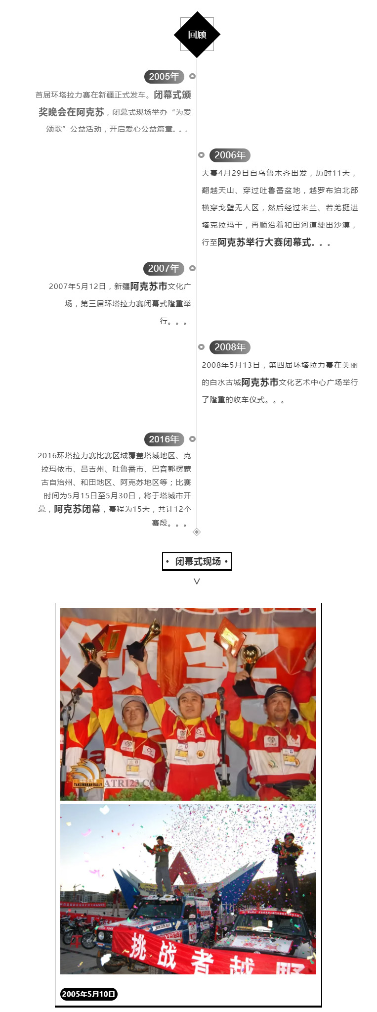 環(huán)塔拉力賽五年在這里舉行閉幕式,2019開(kāi)幕式正式簽約的消息一經(jīng)傳出,有不少環(huán)塔人親切的說(shuō),環(huán)塔回家了!這里是2005第一屆——2008第四屆環(huán)塔拉力賽落幕的城市,明年,我們將回歸這座充滿回憶的城市,讓它成為2019征戰(zhàn)環(huán)塔的起點(diǎn)。