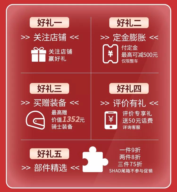 4、V-GO、NS110R、RX125 FI、EX125 FI、H1等車型都有定金膨脹、送騎士裝備等活動(dòng)哦!