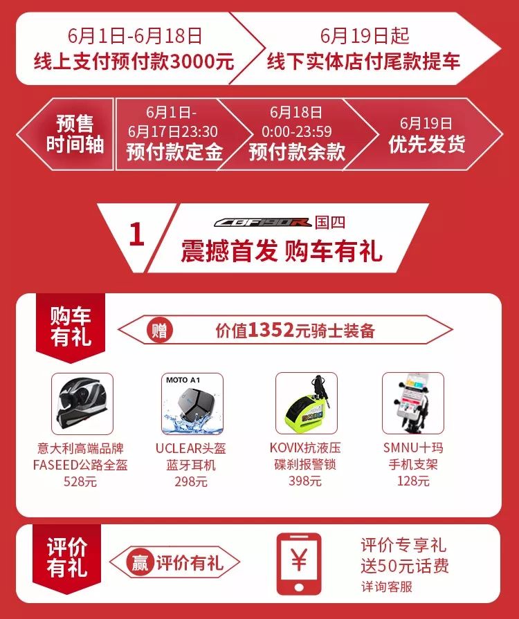 1、國(guó)四CBF190R線上首發(fā),買即贈(zèng)價(jià)值1352元騎士裝備;