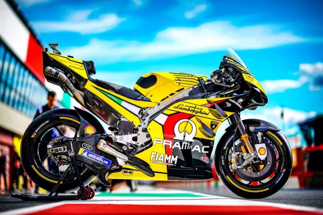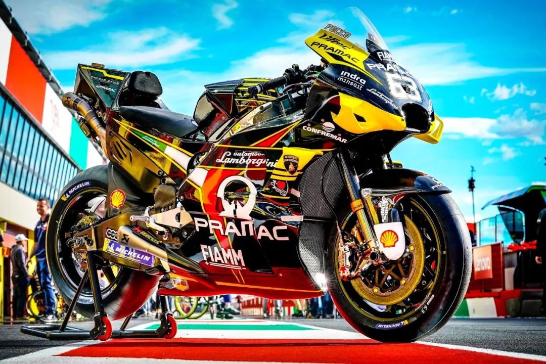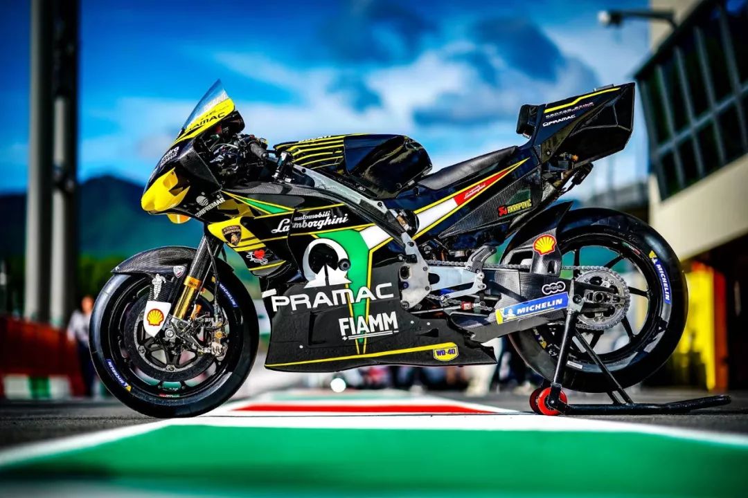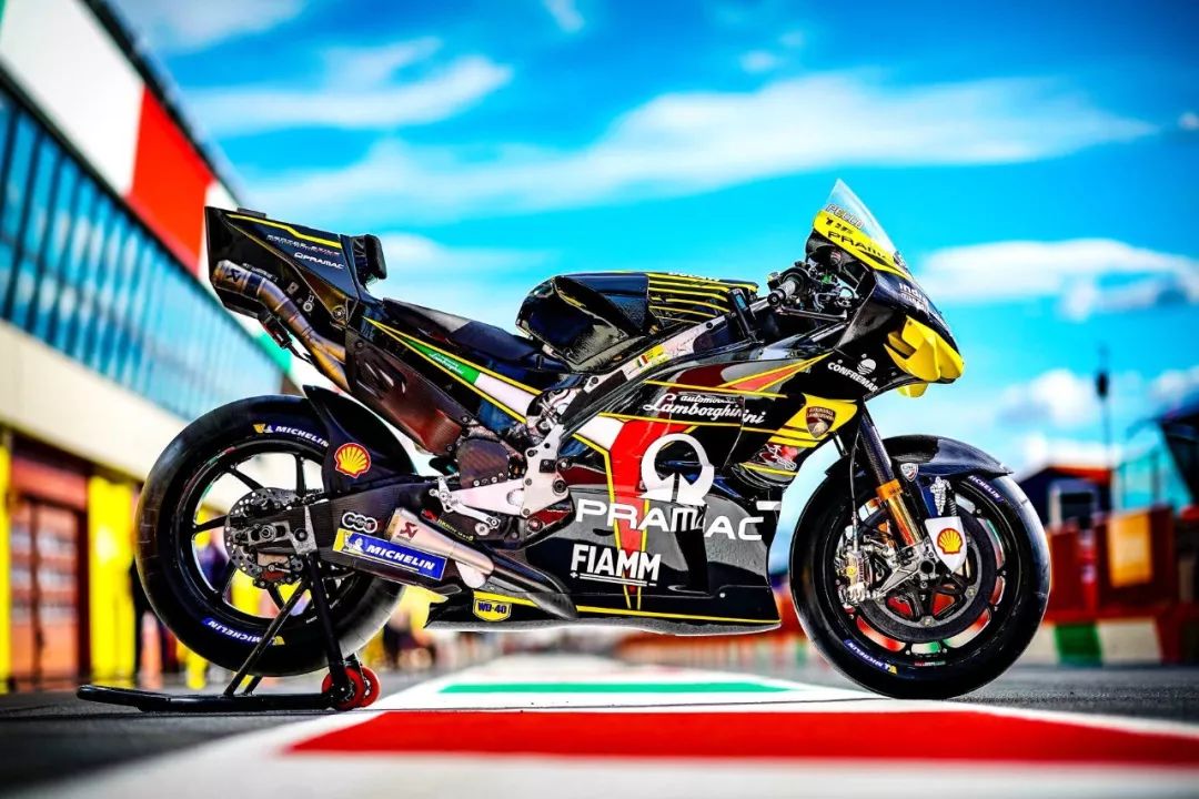 繼去年的意大利站采用了獨(dú)特的 Lamborghini 蘭博堅(jiān)尼圖案出賽、到今年美國站正式簽約獲得意大利跑車制造商的贊助之后,這一場的意大利木杰羅站,Pramac 奔馬車隊(duì)的杜卡迪賽車以及車手的防護(hù)服飾,都換上了一個(gè)黃/黑色為主調(diào)的蘭博堅(jiān)尼車身圖案。
