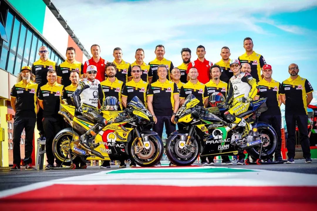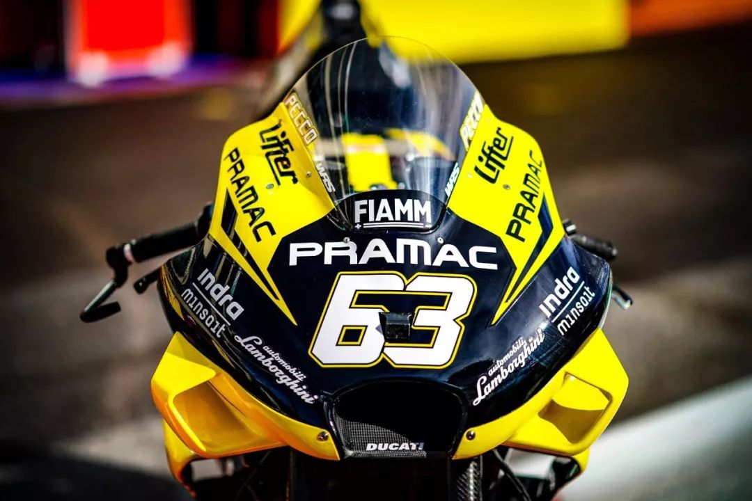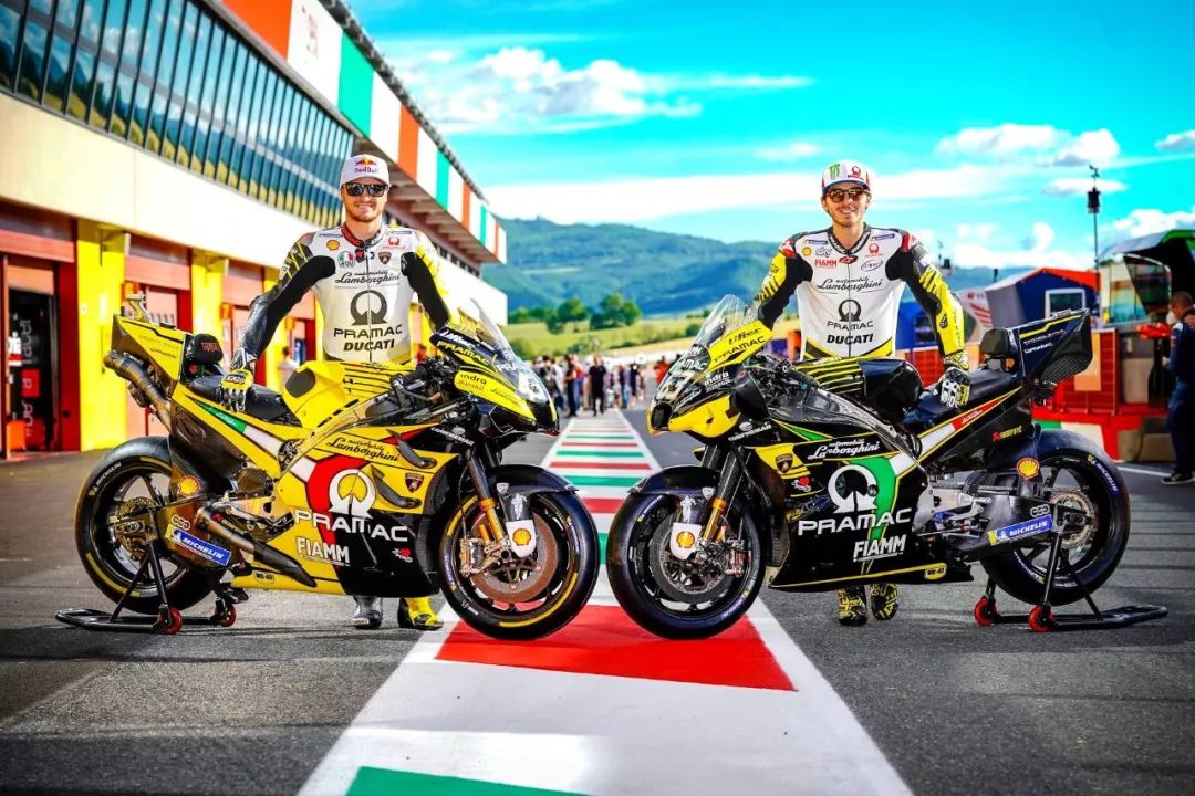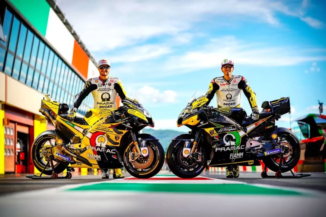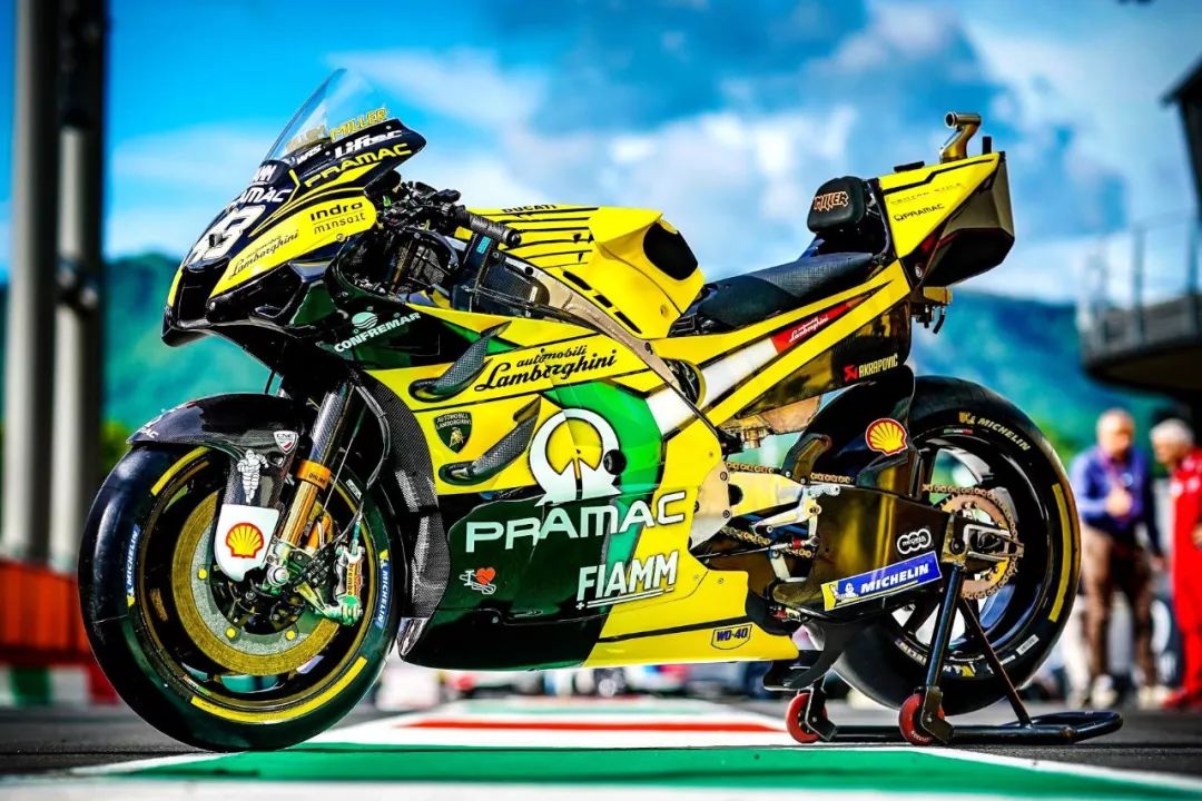 繼去年的意大利站采用了獨(dú)特的 Lamborghini 蘭博堅(jiān)尼圖案出賽、到今年美國站正式簽約獲得意大利跑車制造商的贊助之后,這一場的意大利木杰羅站,Pramac 奔馬車隊(duì)的杜卡迪賽車以及車手的防護(hù)服飾,都換上了一個(gè)黃/黑色為主調(diào)的蘭博堅(jiān)尼車身圖案。