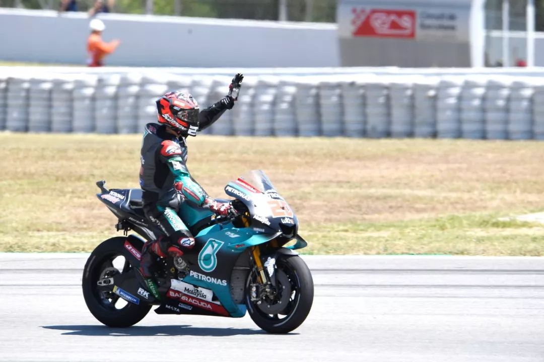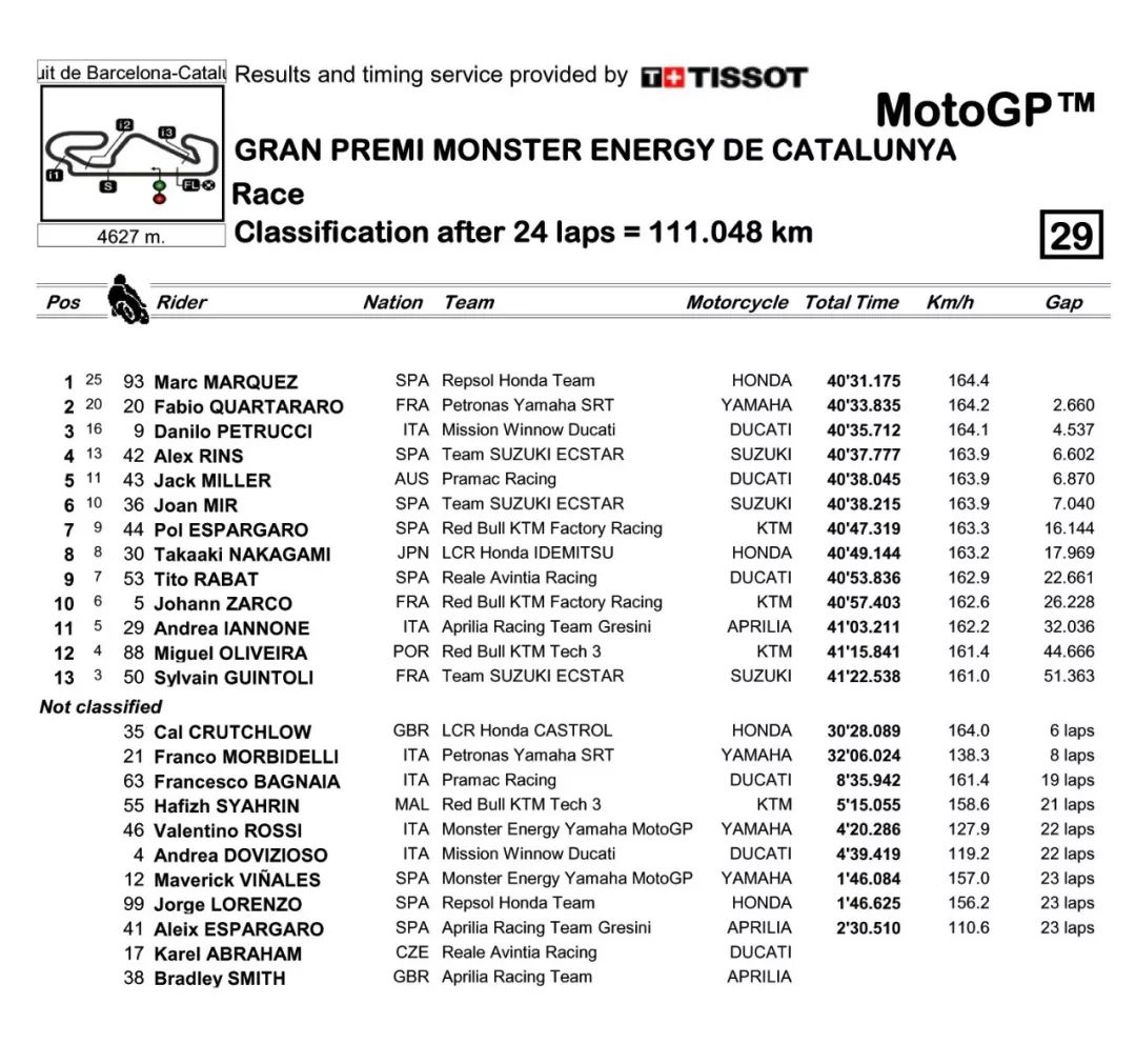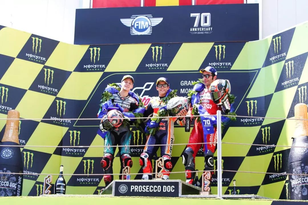 最終,馬昆斯在無人威脅之下、奪得了加泰羅尼亞站的勝利,這是他在本賽季的第四個(gè)分站冠軍。經(jīng)過了一翻激戰(zhàn),Yamaha 馬國(guó)油 SRT 車隊(duì)的小將寇塔拉羅、擠掉了另外兩支工廠車隊(duì)的車手奪得了第二,為自己、也為這支新的 Yamaha 衛(wèi)星車隊(duì)奪得了首次登上頒獎(jiǎng)臺(tái)的機(jī)會(huì)。在上一站意大利木杰羅奪得了首次冠軍的佩魯奇,搶到了頒獎(jiǎng)臺(tái)上的最后一個(gè)位置、獲得了第三。