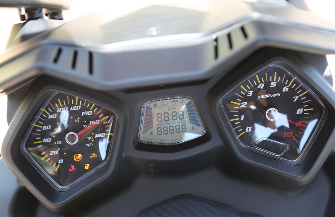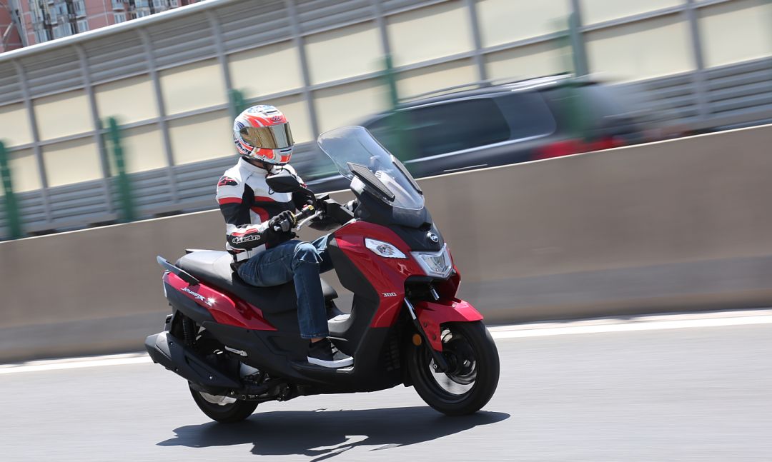 JOYMAX Z 300還擁有一塊兩段可調(diào)的大風(fēng)擋,要通過拆卸調(diào)節(jié),可以提供不錯(cuò)的風(fēng)阻保護(hù)。巡航腳踏的設(shè)置也可以讓駕駛者變換腿部姿勢(shì),緩解疲勞。另外整車騎行時(shí)的振動(dòng)控制也做的不錯(cuò)。排氣噪聲方面JOYMAX Z 300的表現(xiàn)遠(yuǎn)超出我們的預(yù)期,無論是怠速還是騎行時(shí)都非常安靜,尤其是起步和怠速時(shí),噪音水平甚至與不少125踏板差不多。