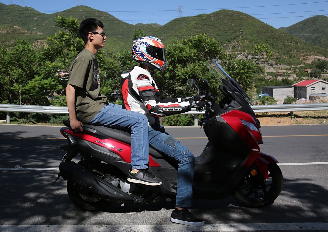 除了減震設(shè)定,JOYMAX Z 300的舒適性還體現(xiàn)在坐墊上,長(zhǎng)且寬大的坐墊對(duì)屁股非常友好,前坐墊前段收窄,方便駕駛者腳部著地,前座帶有腰靠,可以在路況良好時(shí)可以讓腰部向后靠在上面放松。不僅前座舒服,后座的舒適度也不會(huì)差,厚實(shí)的海綿配合較軟的后減震,可以給你后座的姑娘提供非常安心的乘坐感受。而且坐墊長(zhǎng)度非常寬裕,如下圖所示,前座人員身高183cm,后座人員身高185cm,兩人調(diào)整到舒適的坐姿后,從后座人員襠部到前座人員后腰還有20cm以上的間隔,乘坐空間非常充裕。