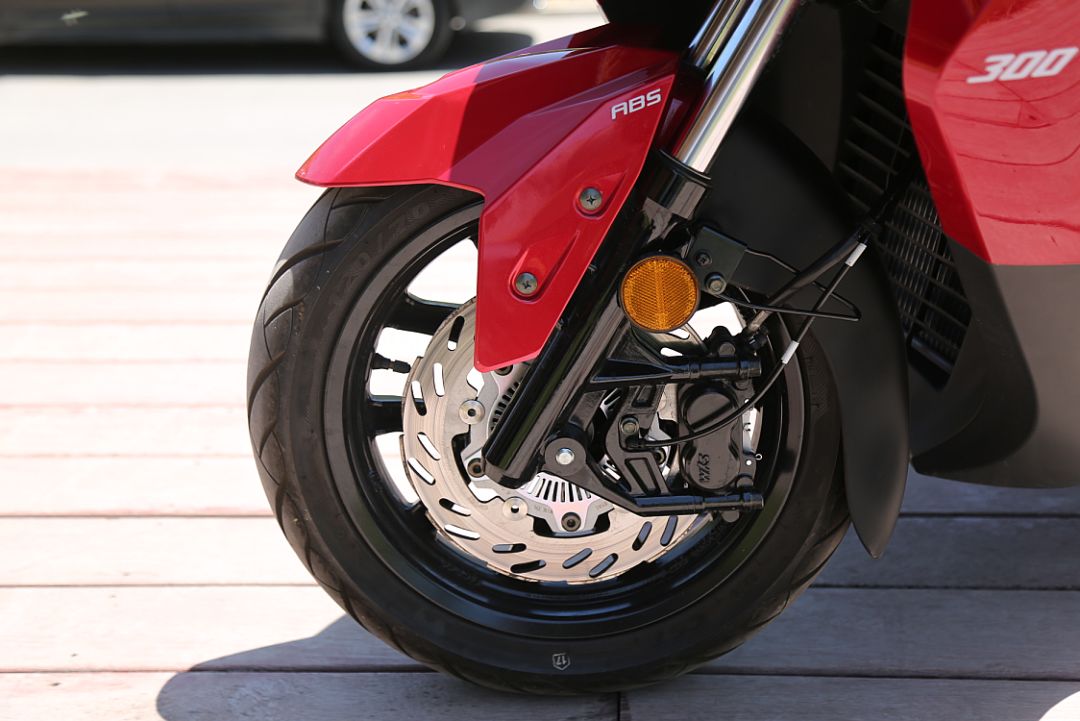 制動(dòng)方面配備了前對(duì)向四活塞輻射式卡鉗配260mm浮動(dòng)盤,后單向雙活塞卡鉗配240mm制動(dòng)盤,從規(guī)格上來看在同級(jí)別中是比較豪華的,同時(shí)前后輪還標(biāo)配了進(jìn)口博世ABS系統(tǒng),進(jìn)一步提高制動(dòng)安全性。輪胎采用正新品牌,規(guī)格前120/70-14,后140/60-13。在緊急制動(dòng)測(cè)試中,JOYMAX Z 300的表現(xiàn)沒有辜負(fù)高規(guī)格的制動(dòng)配置,同樣屬于同級(jí)別中較優(yōu)的水平,制動(dòng)過程非常線性。在制動(dòng)力分配上,后剎的制動(dòng)力度會(huì)更大一些,會(huì)更容易到達(dá)抱死臨界狀態(tài),ABS介入時(shí)機(jī)也相對(duì)更早。前剎制動(dòng)手感更好一些,ABS介入的時(shí)機(jī)也會(huì)稍晚。