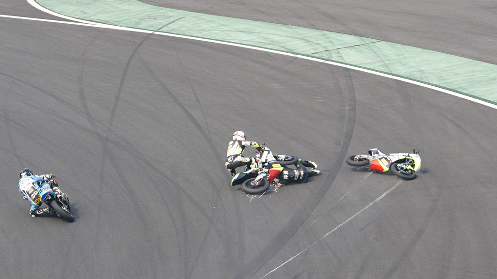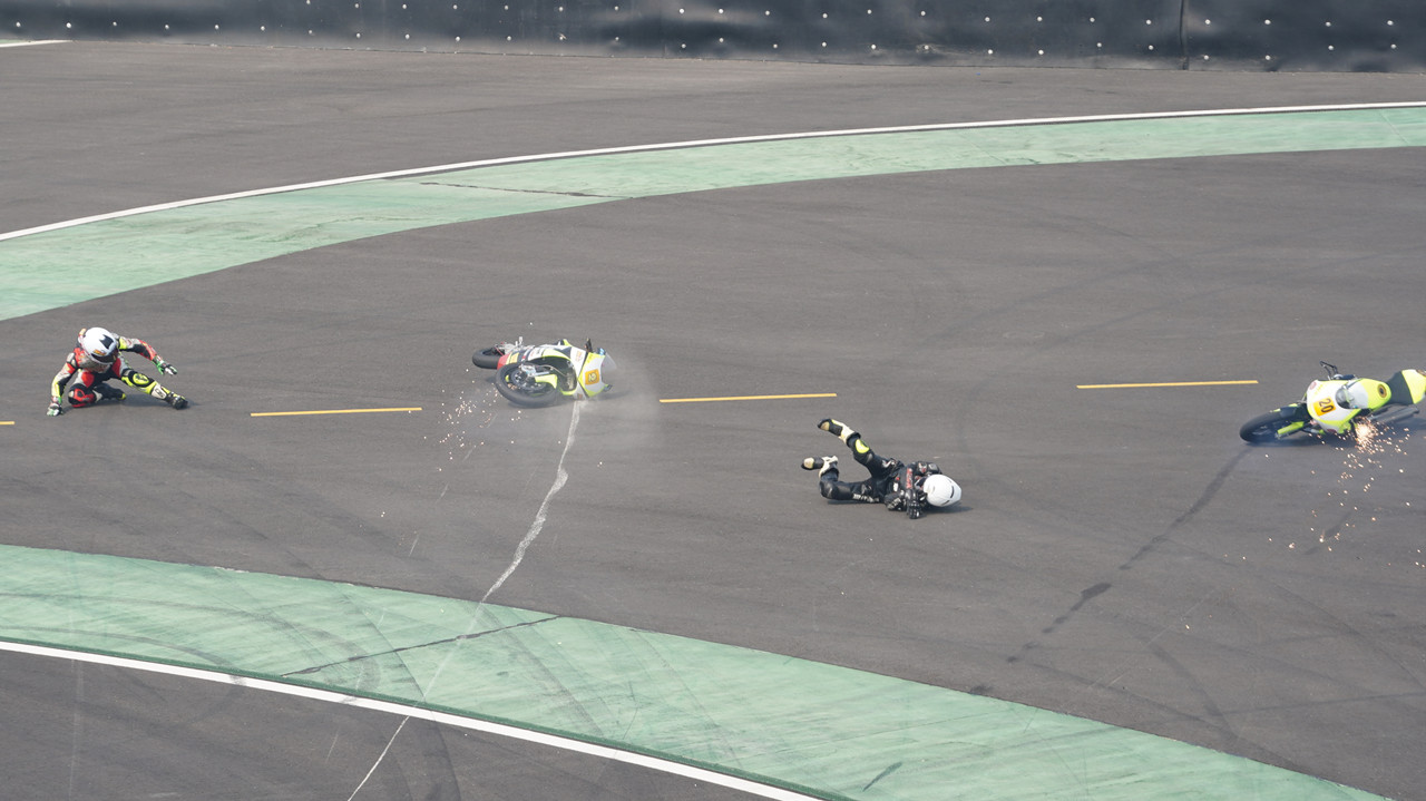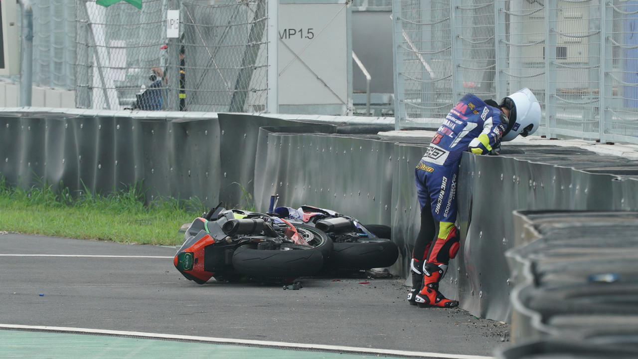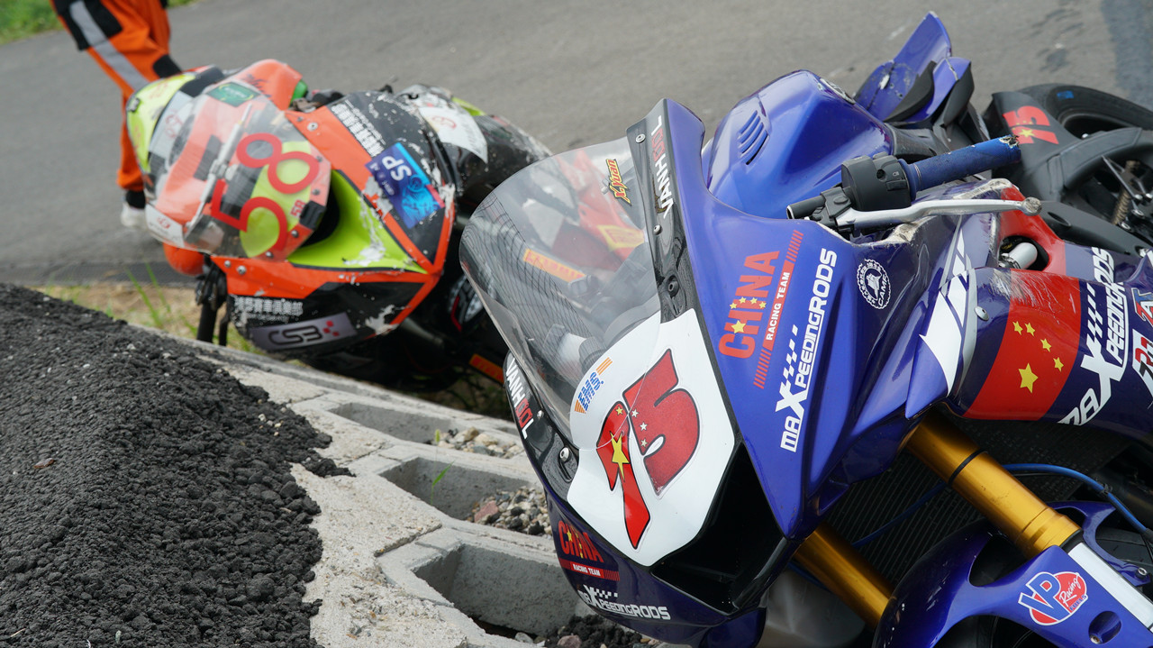在CSBK SS SP(600cc)組第二回合比賽中,600cc原廠組中頭號(hào)種子選手國(guó)貴車(chē)隊(duì)的75車(chē)手王孝源。在第十圈的時(shí)候與天津橋藝車(chē)隊(duì)的58號(hào)車(chē)手張濤發(fā)生了碰撞雙雙遺憾退賽,好在雙方車(chē)手的身體并無(wú)大礙,但從圖片中可以感覺(jué)到王孝源非常的不甘心。