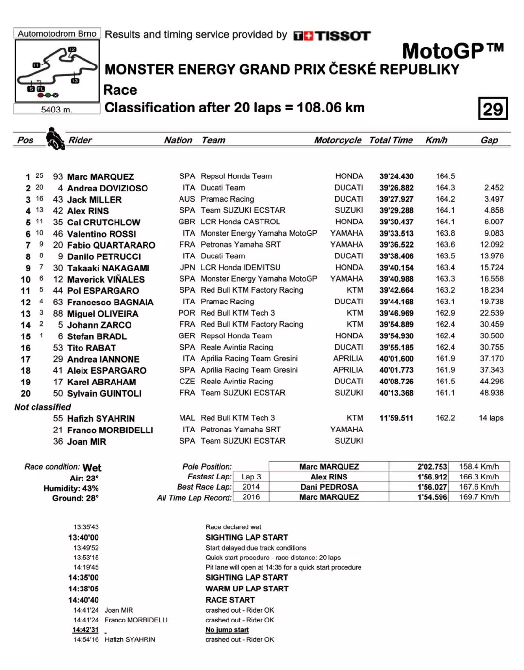 受天氣影響,MotoGP 級(jí)別的比賽、較原定時(shí)間延遲了 40 分鐘,賽程也縮減為只有 20 圈、共約 108.06 公里。比賽起步,馬昆斯一如既往般搶先、帶頭,后面車群隨后跟進(jìn)。比賽的前半程,馬昆斯一直在前帶頭,距離不遠(yuǎn)處,杜維斯奧索(Andrea Dovizioso)、林斯(Alex Rins)、米勒(Jack Miller)在后面緊追不舍。